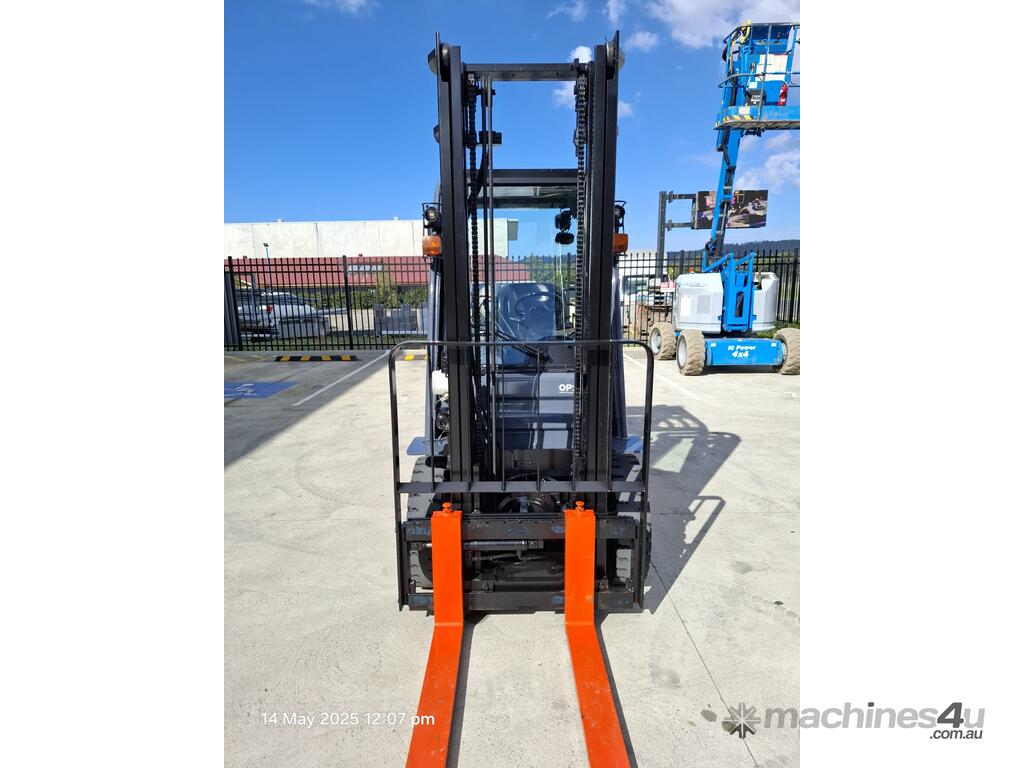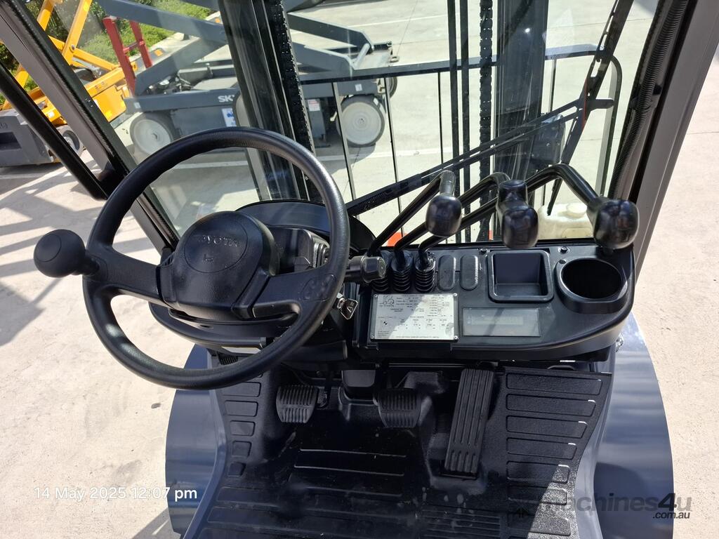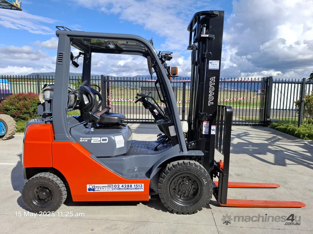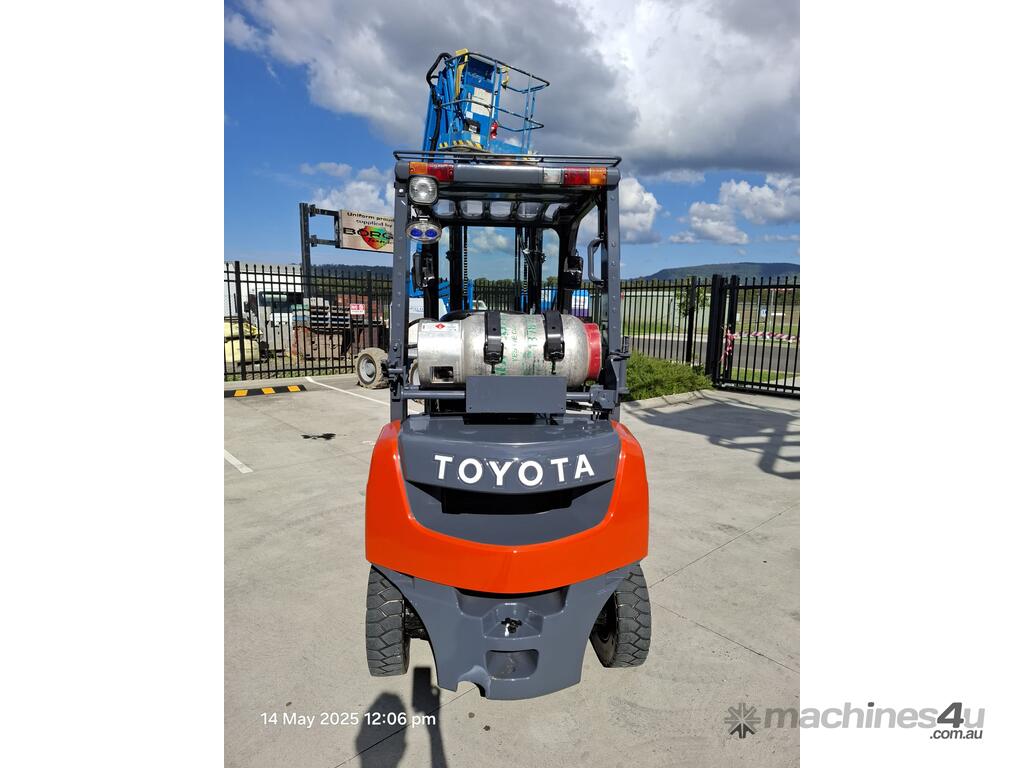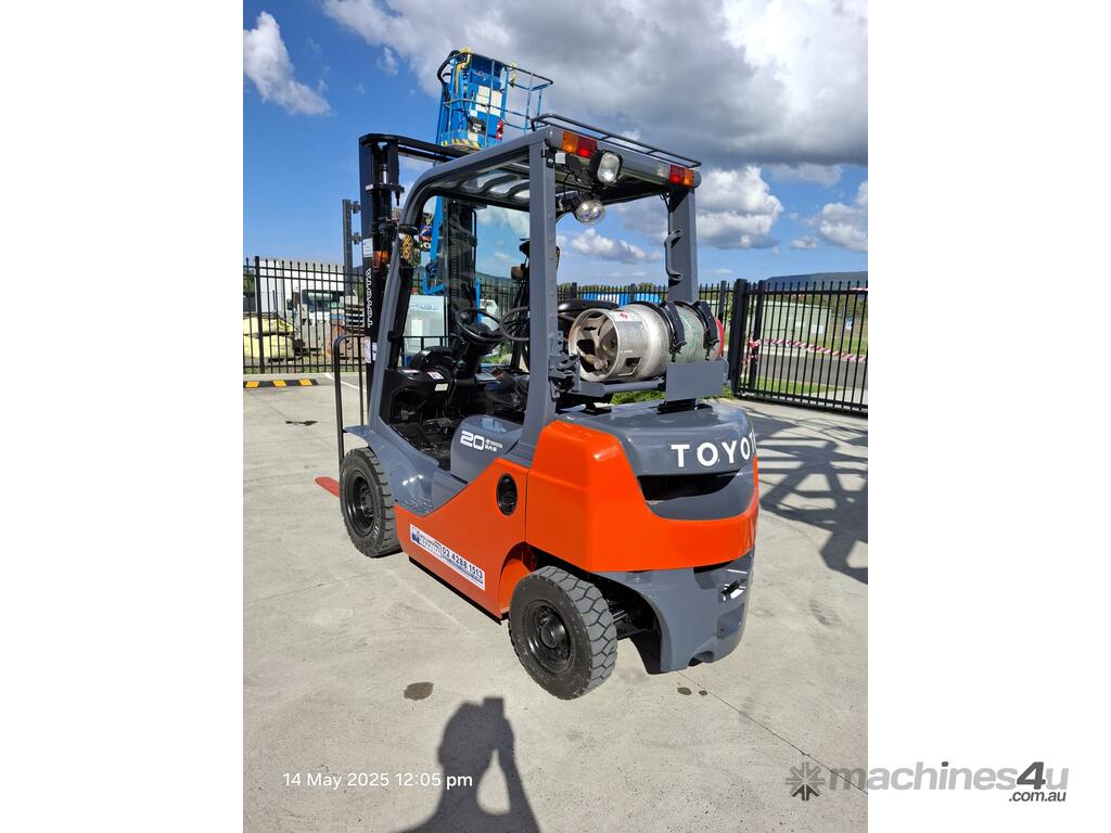 2019 Toyota 8FG20, 2 Tonne LPG with a 2-stage standard mast with lifting capacity of 3.7m. Fitted with side shift and good new solid tyres. The machine has glass cover at the front protecting the operator from rain.