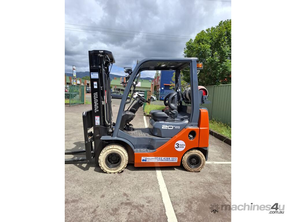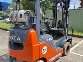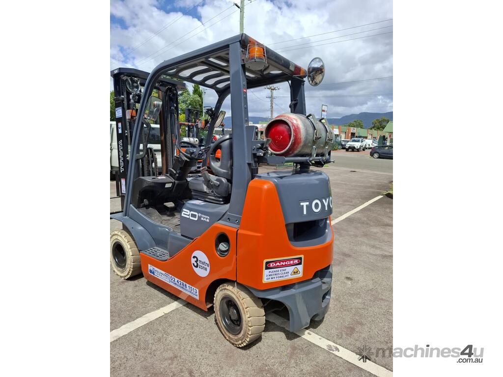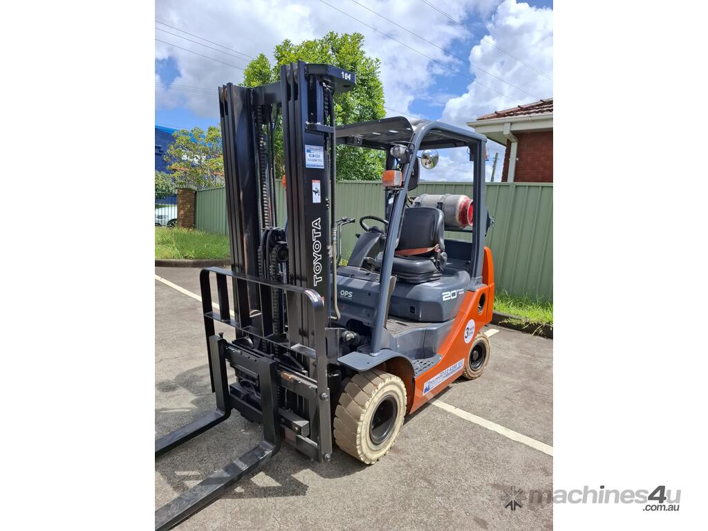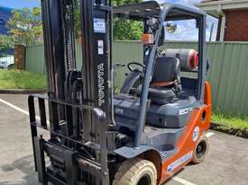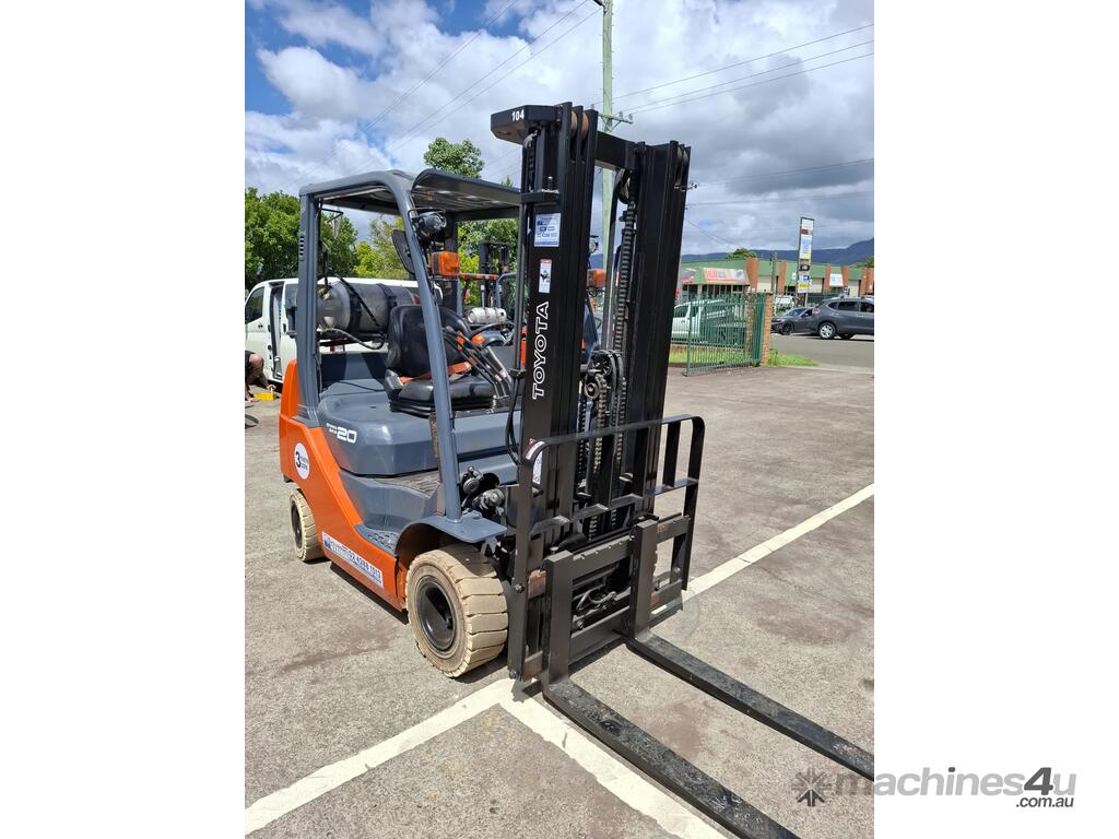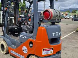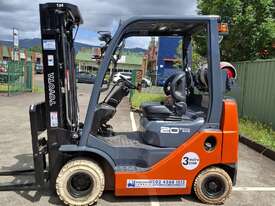 2019 Toyota 8FGK20, 2 Tonne LPG with a 3-stage container mast with lifting capacity of 4.7m. Fitted with side shift good solid non-marking tyres.