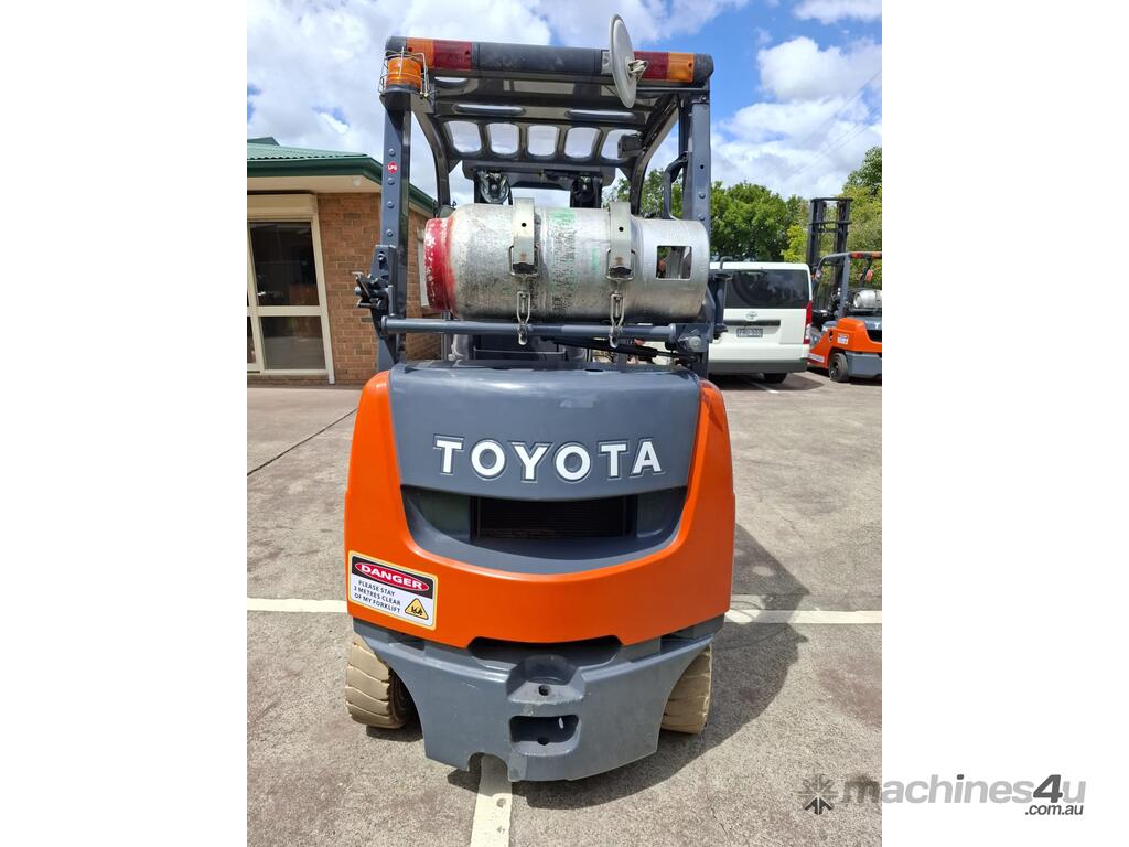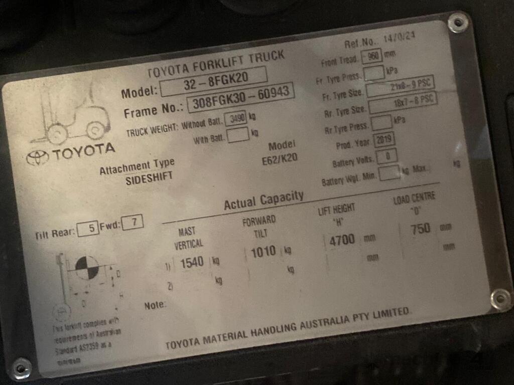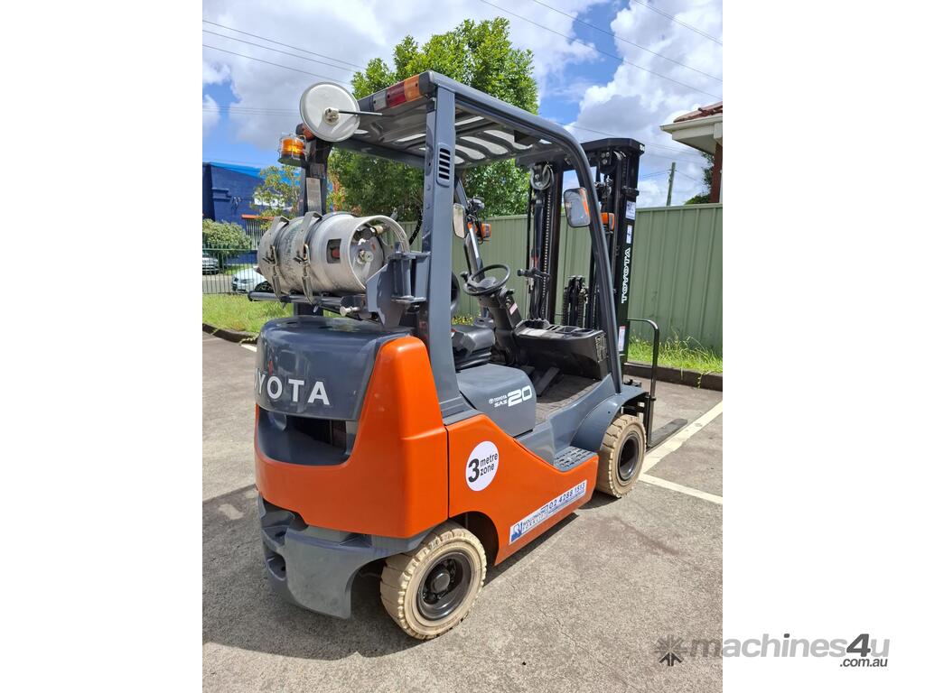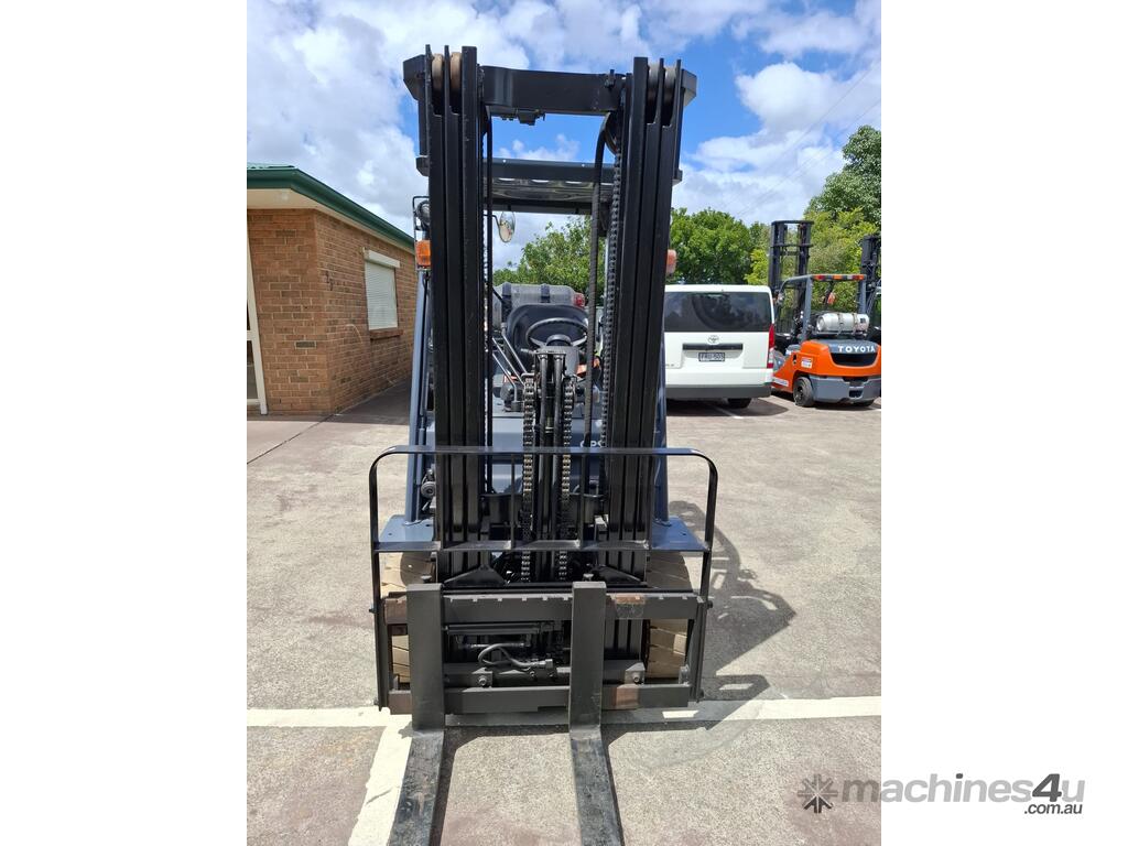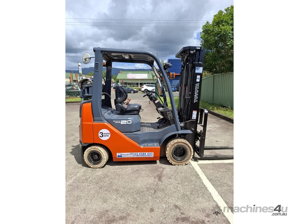 2019 Toyota 8FGK20, 2 Tonne LPG with a 3-stage container mast with lifting capacity of 4.7m. Fitted with side shift good solid non-marking tyres.