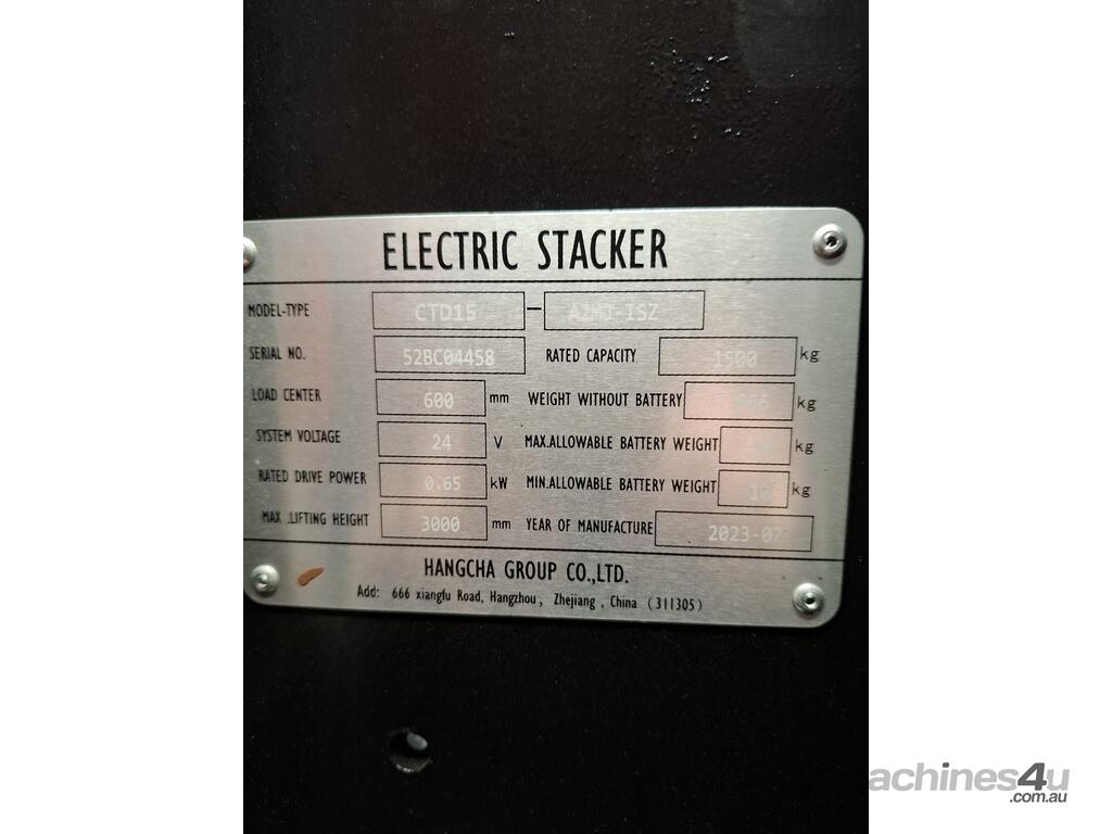 2023 Hangcha CTD15-A2MJ-ISZ, 1.5t capacity with a 2-stage mast and 3 m lift was recently traded in. It still comes with 18 months manufactures warranty or 2000 hours whichever comes first. Currently the stacker has only done 13 hours so it almost brand new.