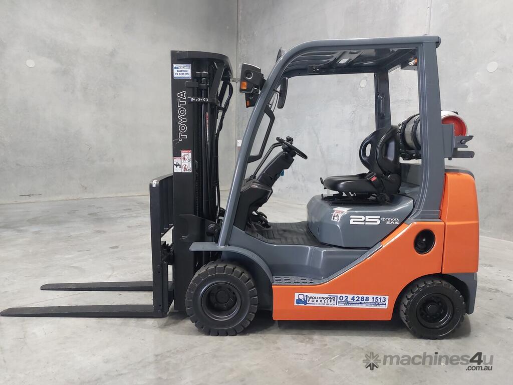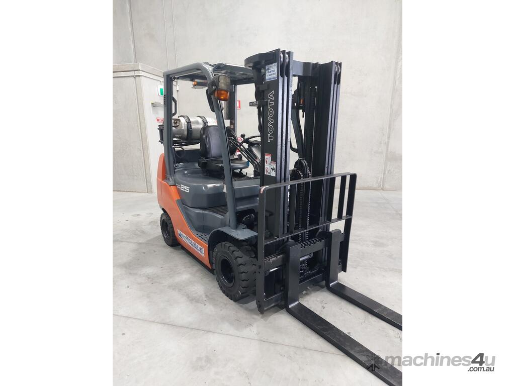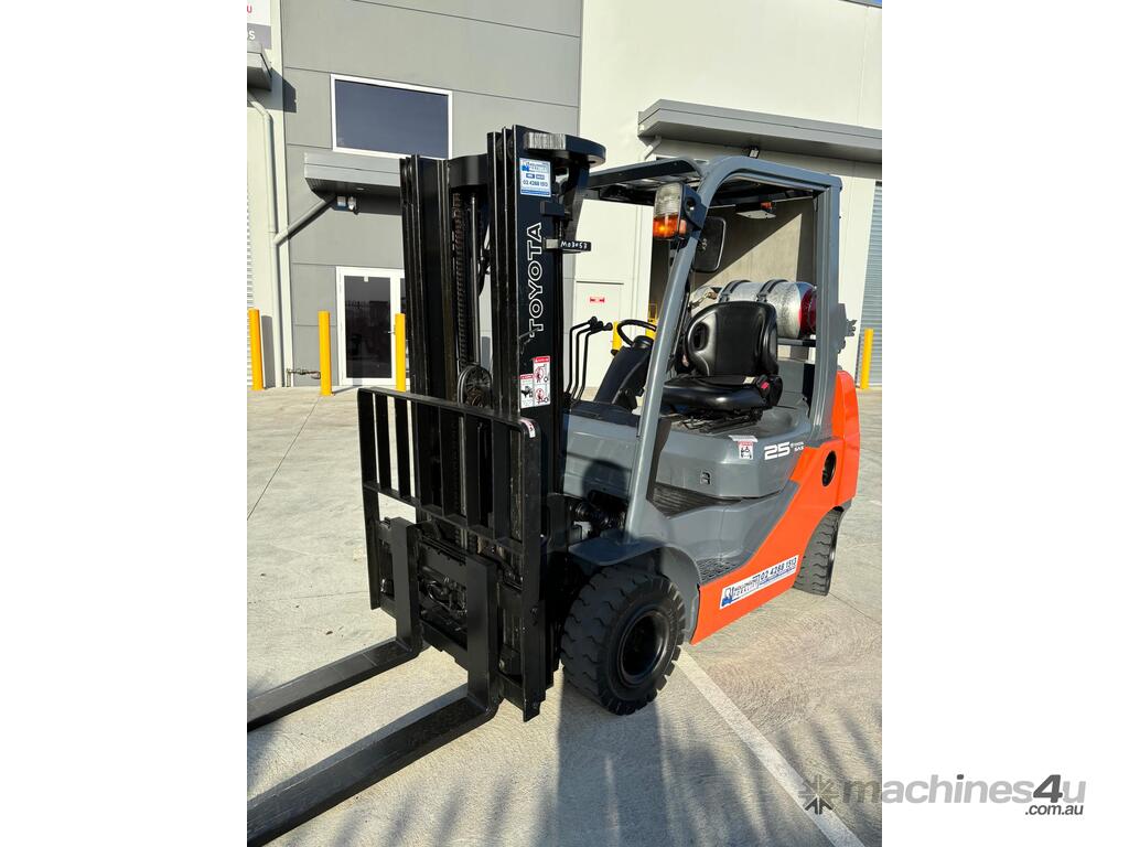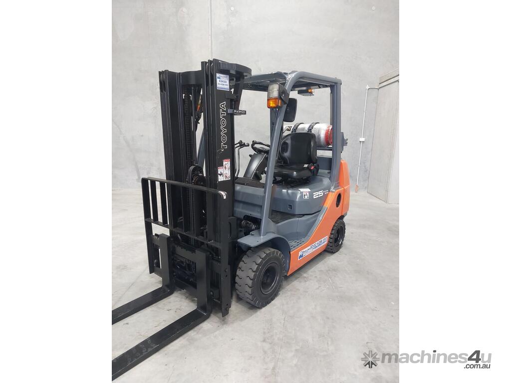 2007 Toyota 8FGK25, 2.5 Tonne LPG with a 3-stage container mast and lifting capacity of 4.3m. This current model, compact machine is very useful when operating in narrow spaces. Fitted with side shift, in-build digital scale and brand-new solid tyres.