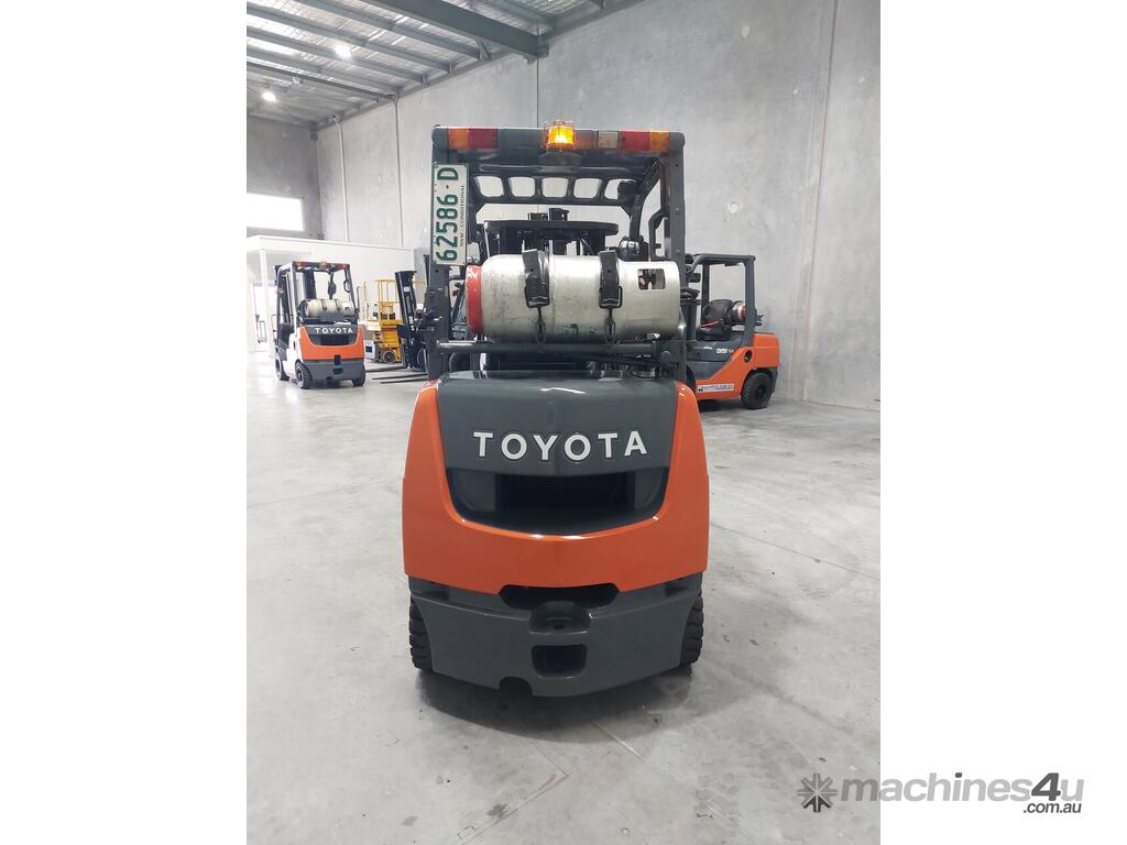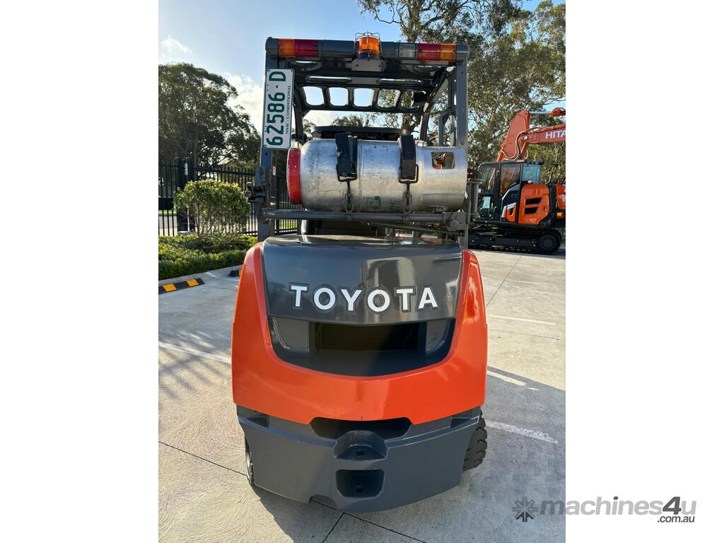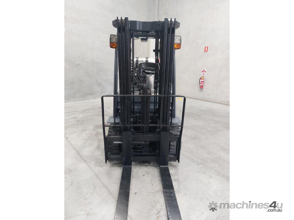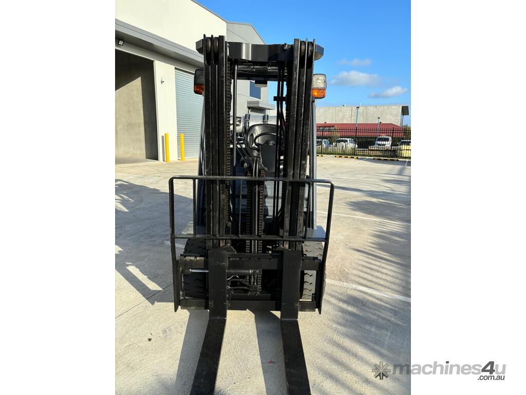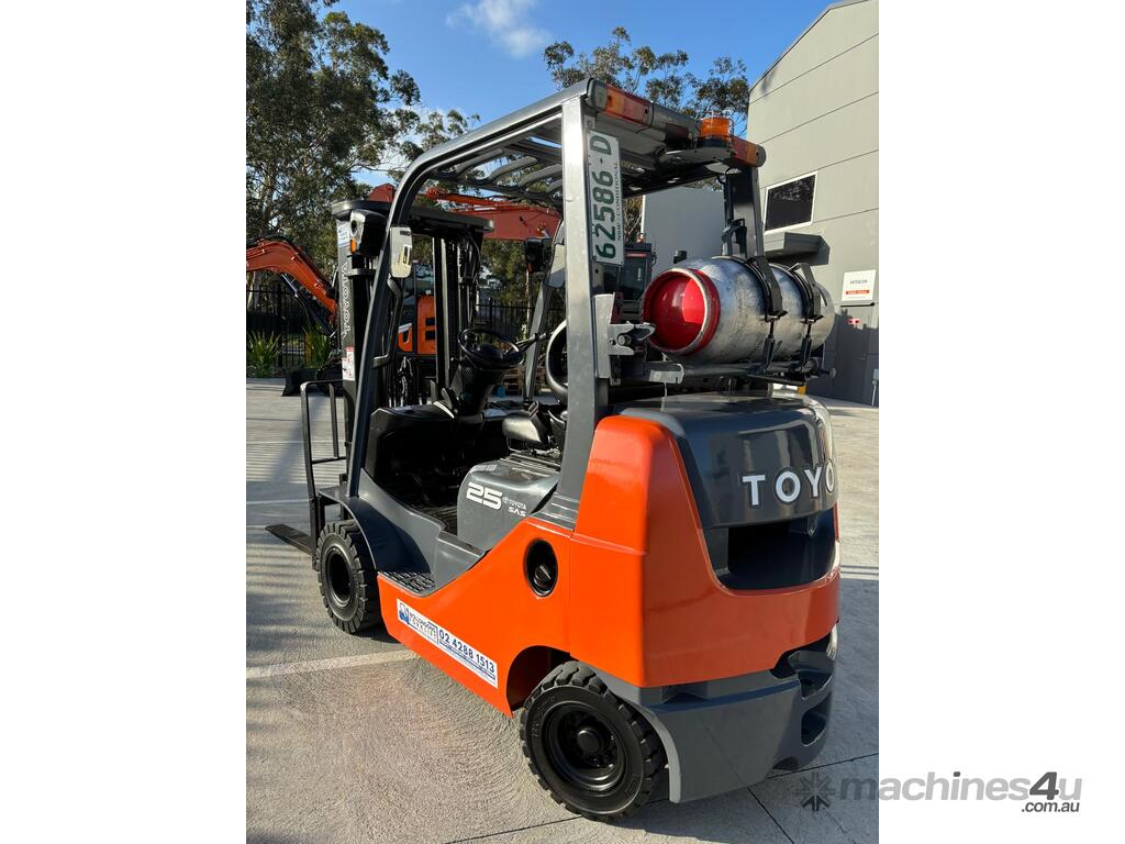 2007 Toyota 8FGK25, 2.5 Tonne LPG with a 3-stage container mast and lifting capacity of 4.3m. This current model, compact machine is very useful when operating in narrow spaces. Fitted with side shift, in-build digital scale and brand-new solid tyres.