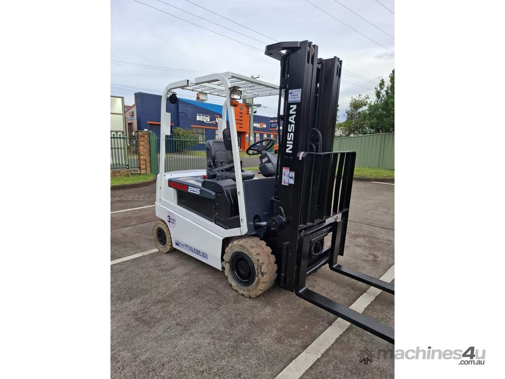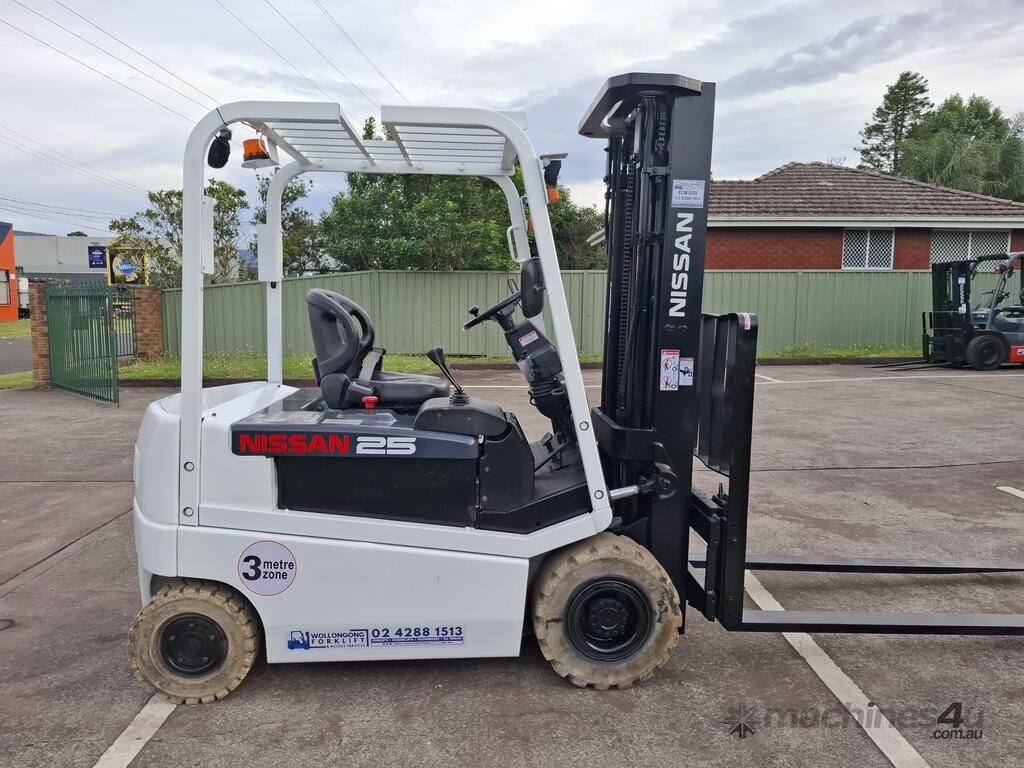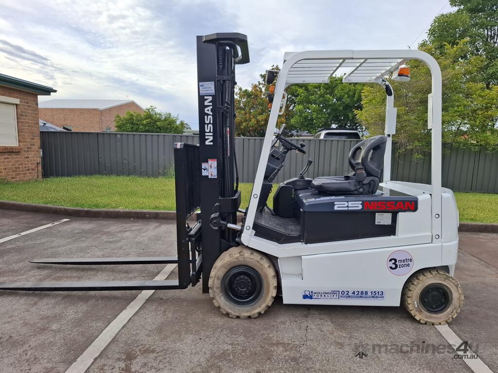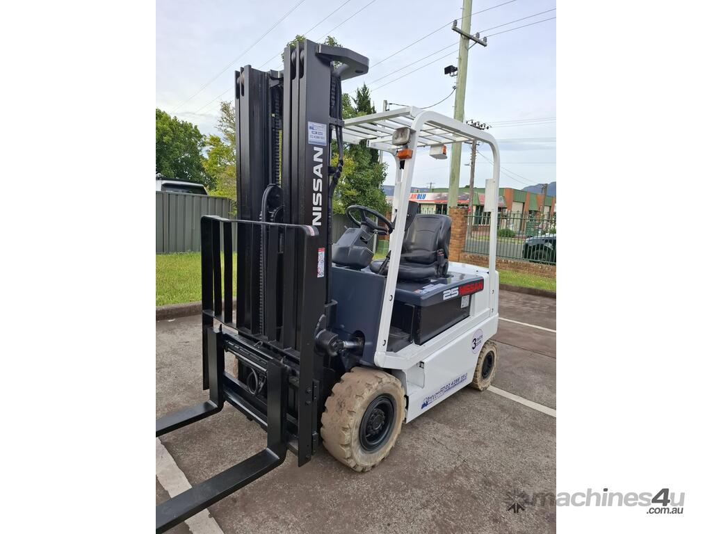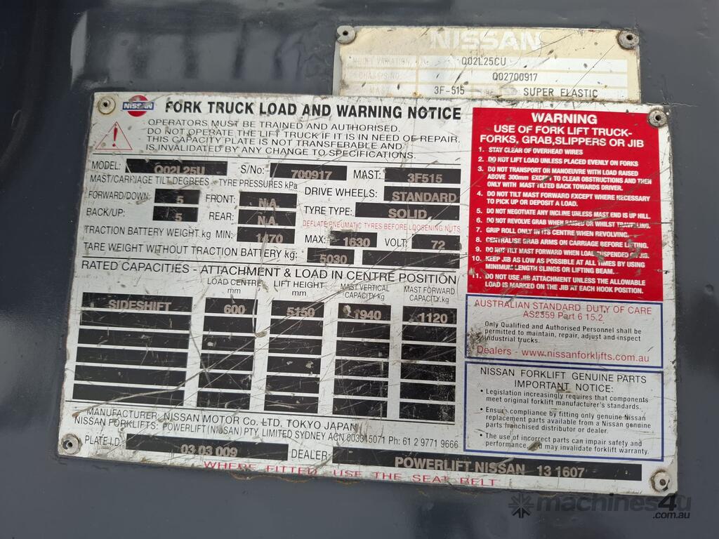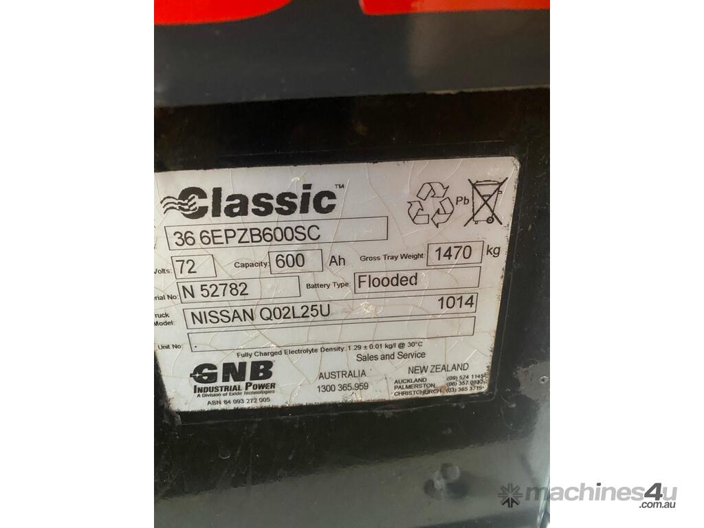 2006 Nissan Q02L25U, 2.5 Tonne Electric with a 3-stage container mast and 5.15m lifting capacity. This 4-wheel forklift is fitted with side shift and solid non-marking tyres. It is also fitted with 1.8m tynes. The battery is a 600Ah and has a 48v charger with 350amp