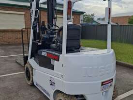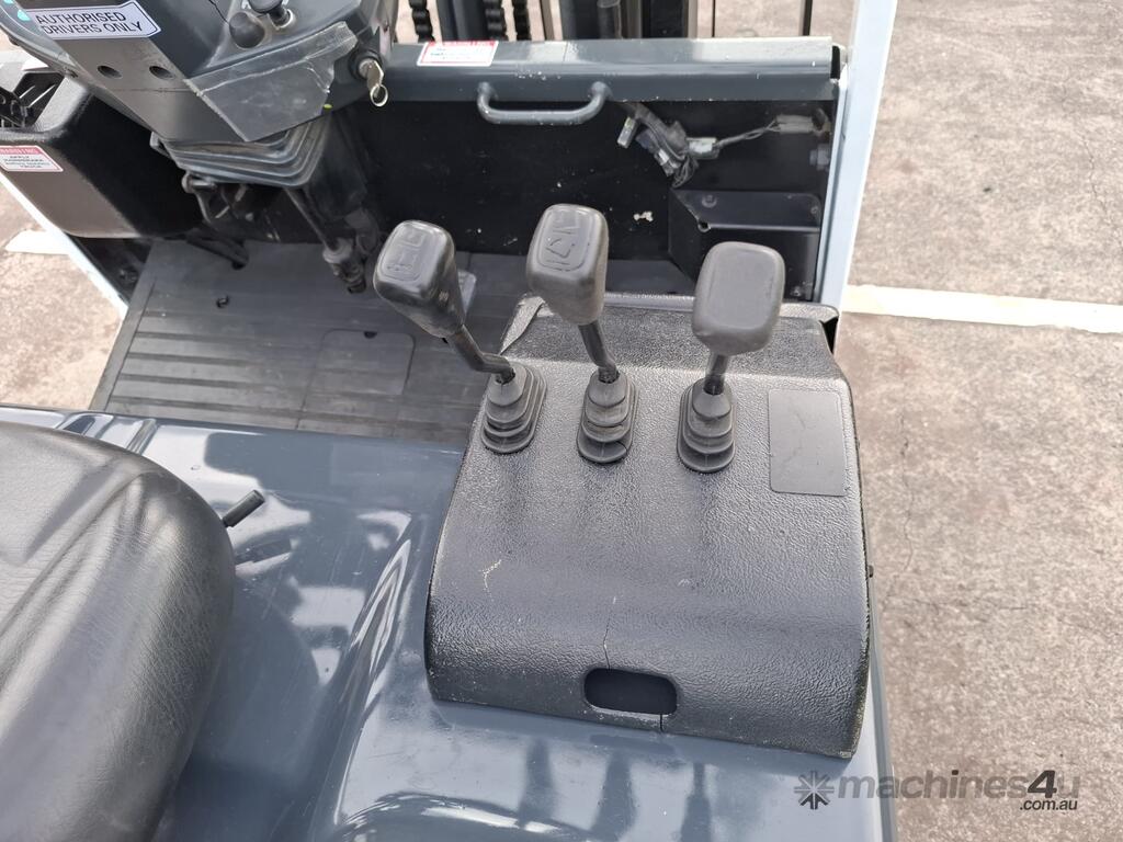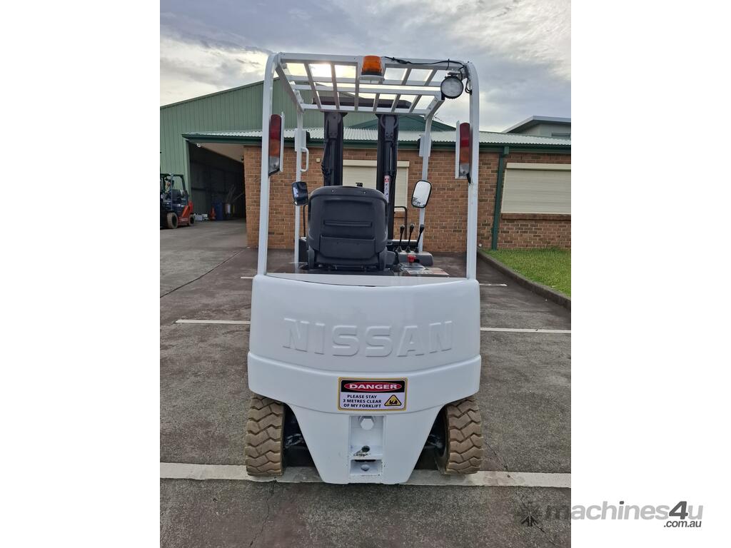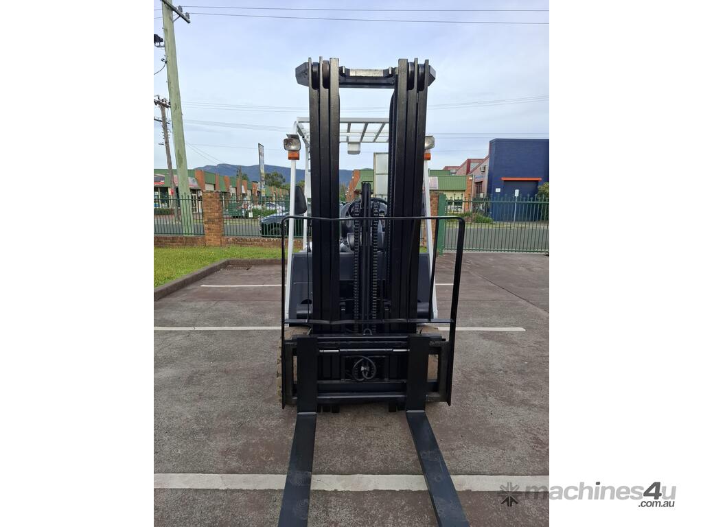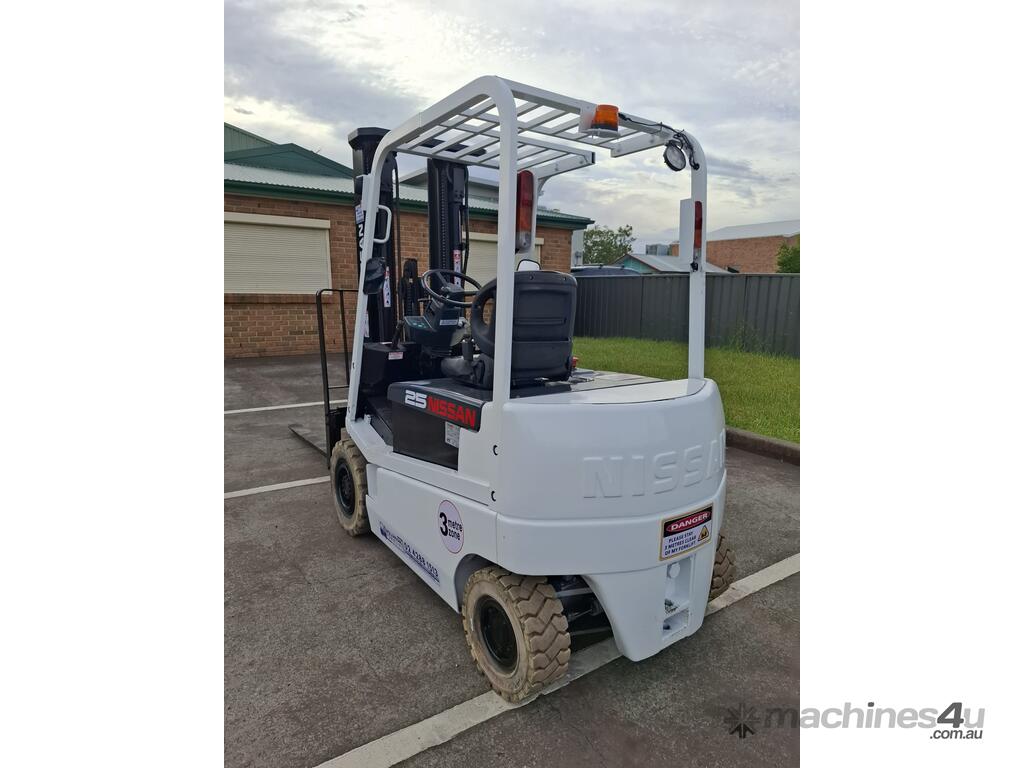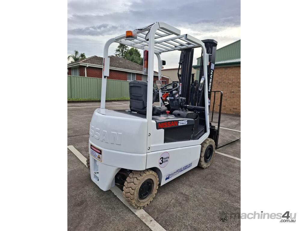 2006 Nissan Q02L25U, 2.5 Tonne Electric with a 3-stage container mast and 5.15m lifting capacity. This 4-wheel forklift is fitted with side shift and solid non-marking tyres. It is also fitted with 1.8m tynes. The battery is a 600Ah and has a 48v charger with 350amp