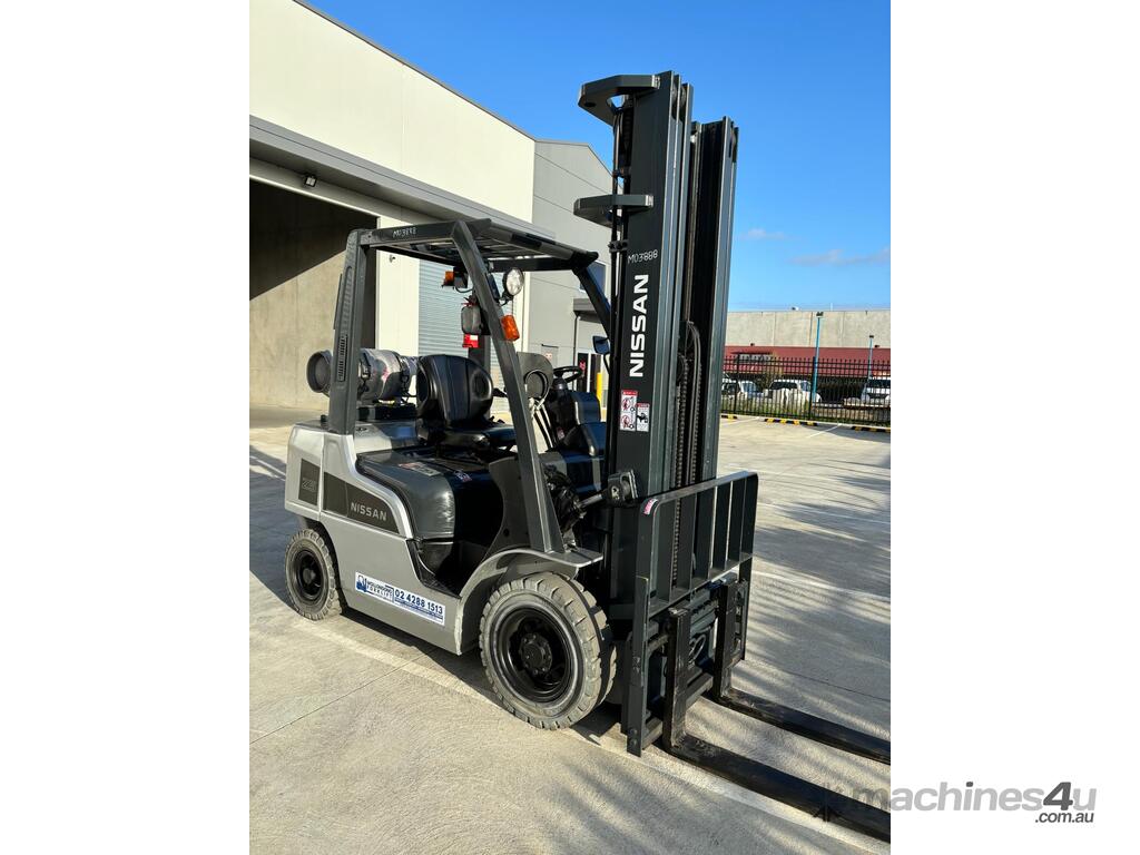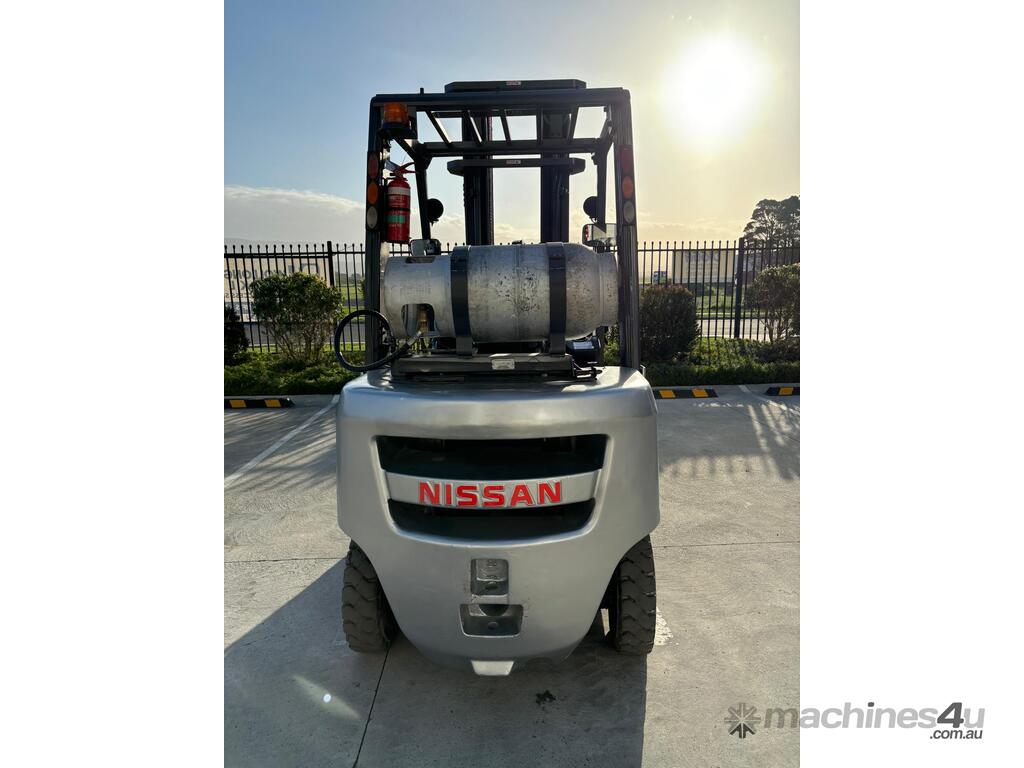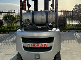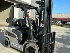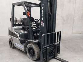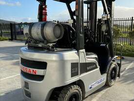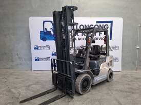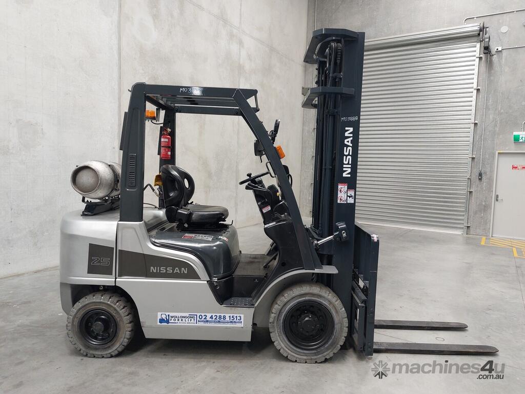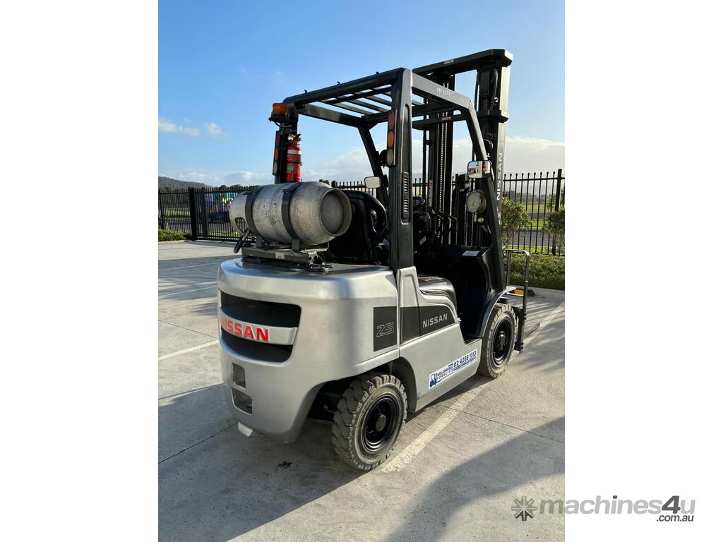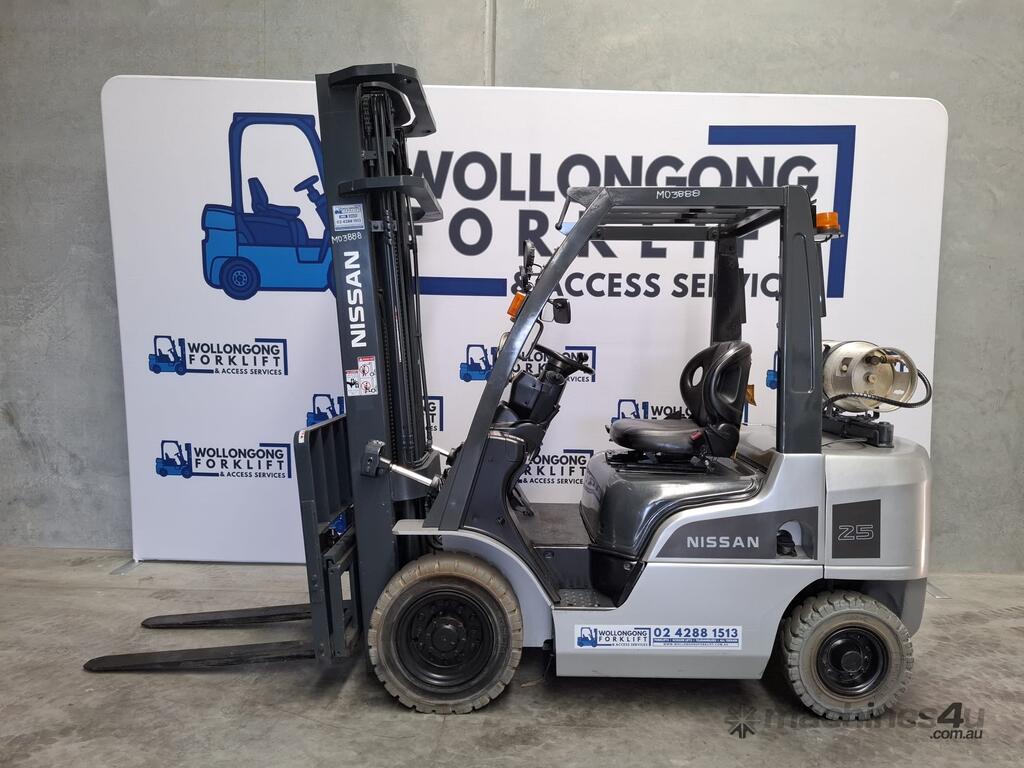 Nissan P1F2A25DU, 2.5 Tonne LPG with a 3-stage container mast with lifting capacity of 6m. Fitted with side shift