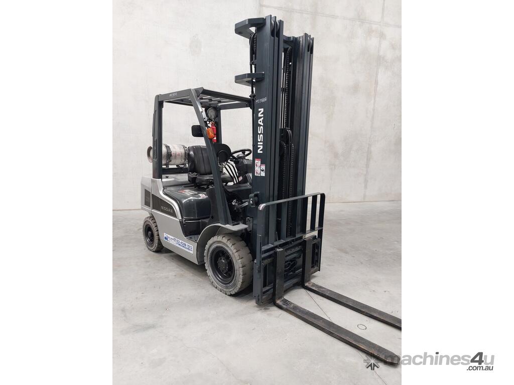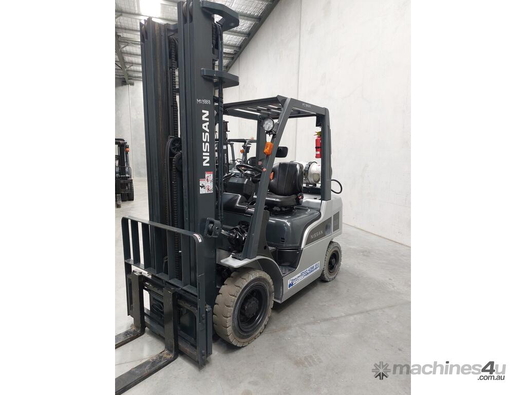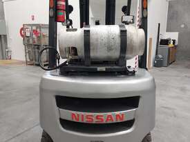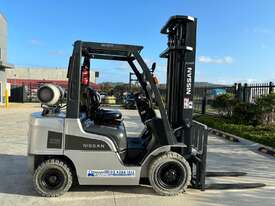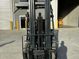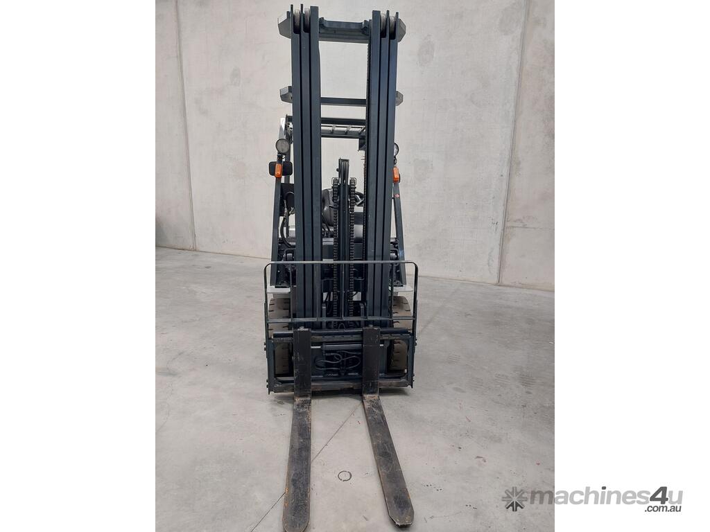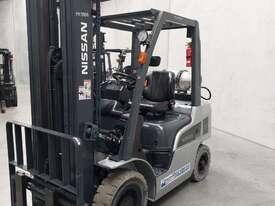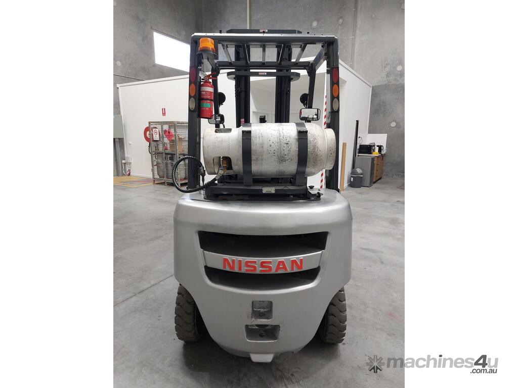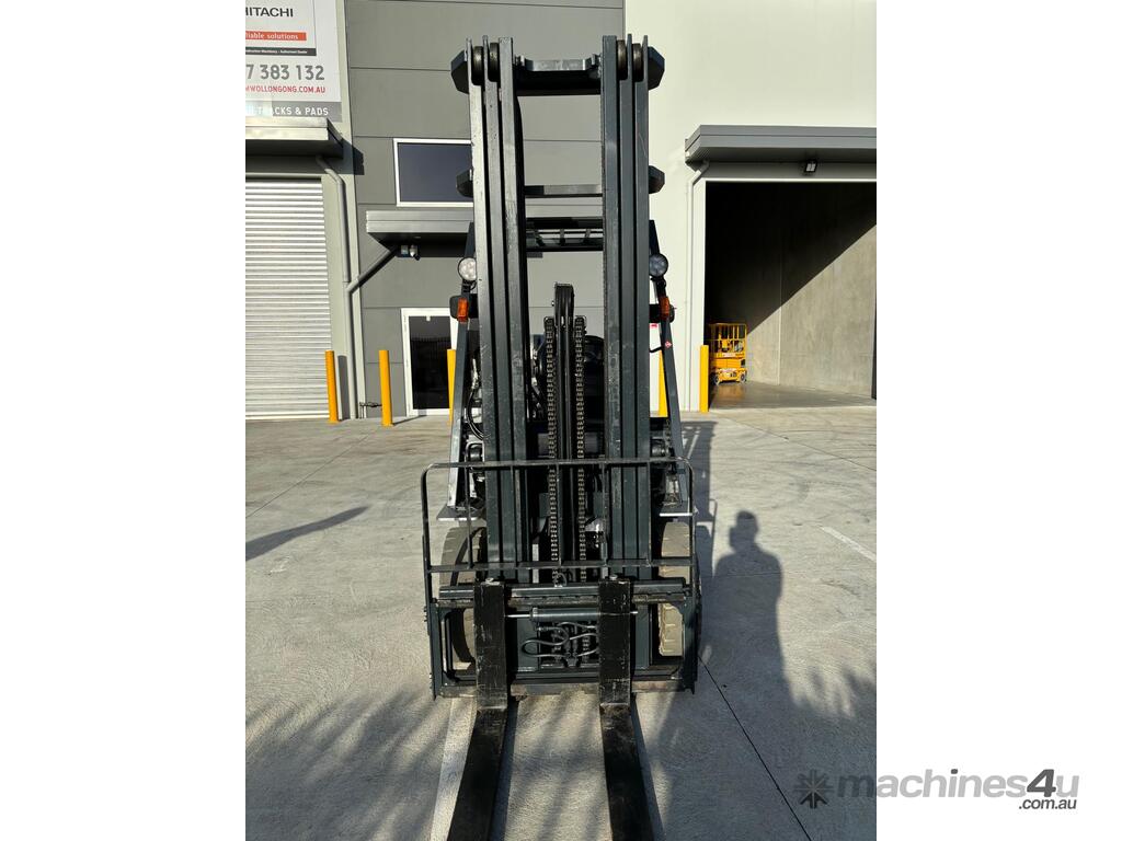 Nissan P1F2A25DU, 2.5 Tonne LPG with a 3-stage container mast with lifting capacity of 6m. Fitted with side shift