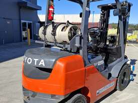 Toyota 8FG25, 2.5 Tonne LPG with a 3-stage container mast with lifting capacity of 4.5m. Fitted with rotator and solid tyres. The rotator is rated at 2,250kg 600mm load centre