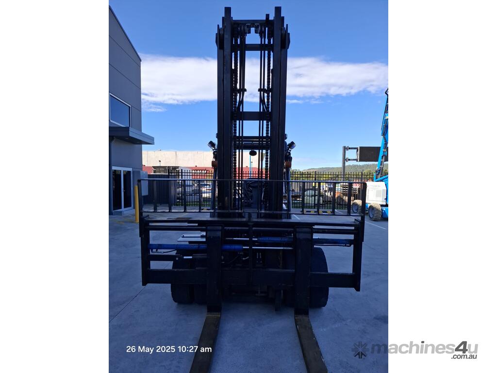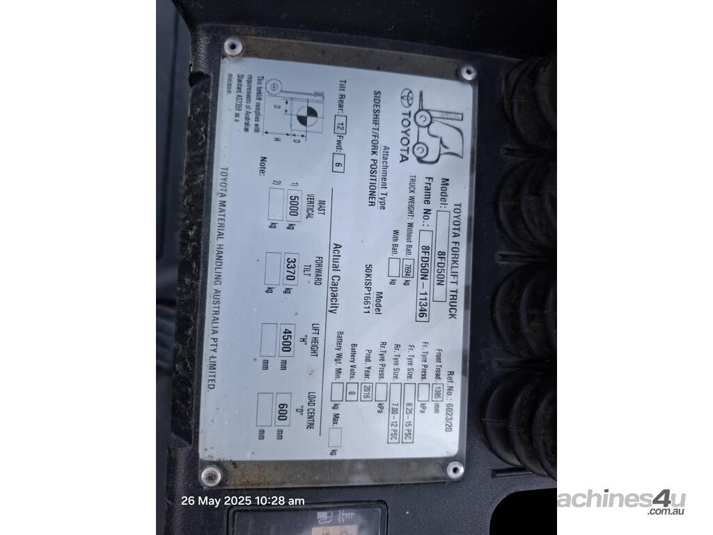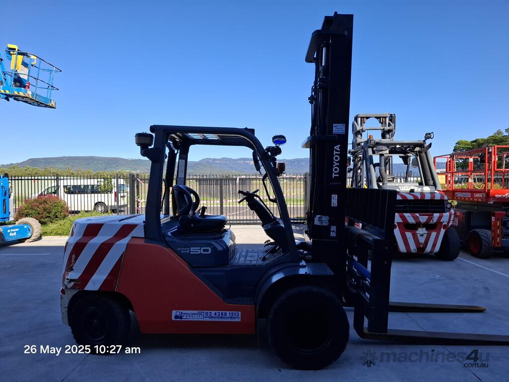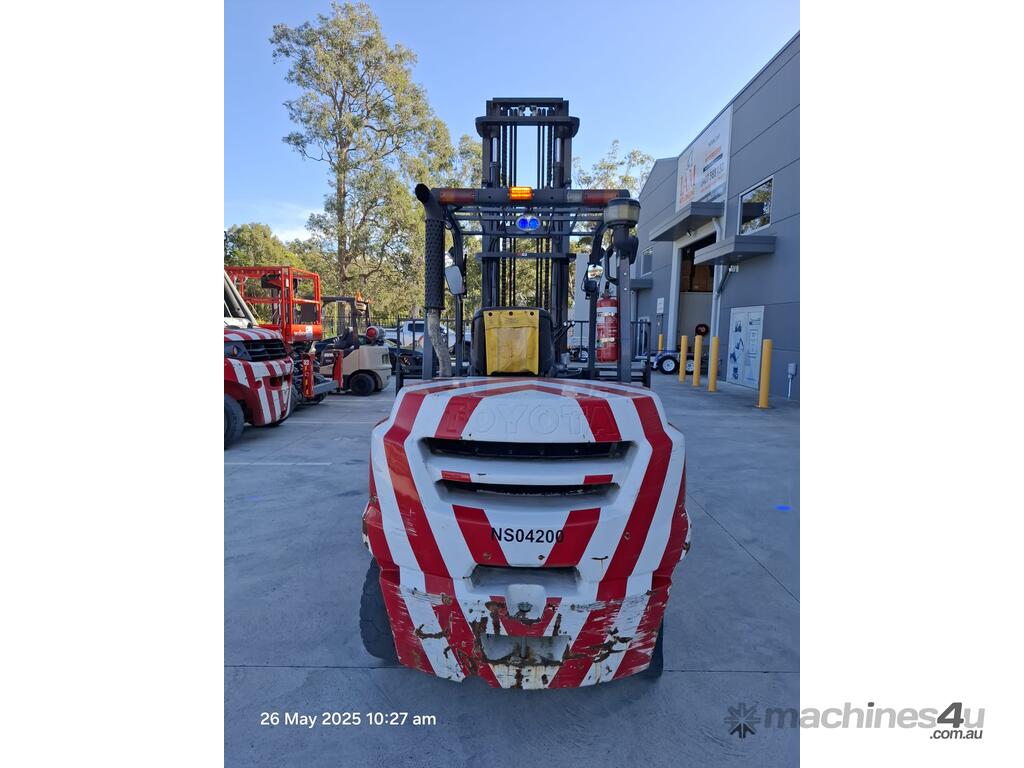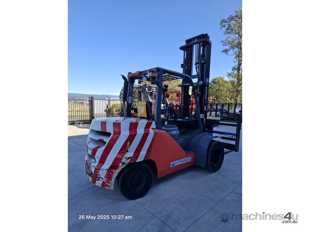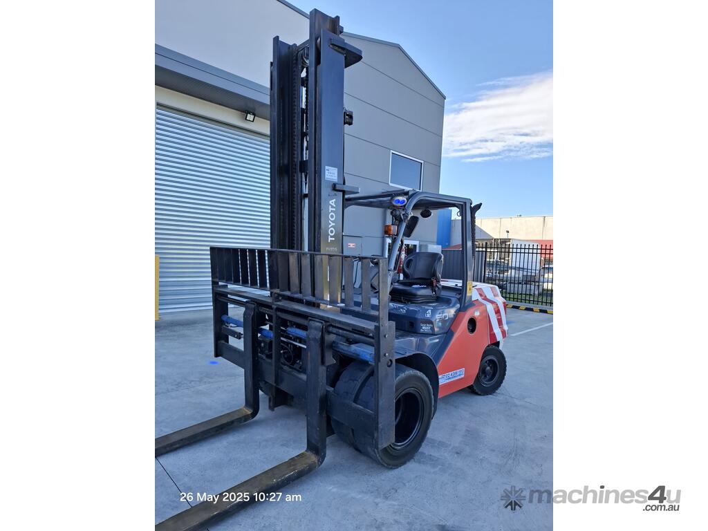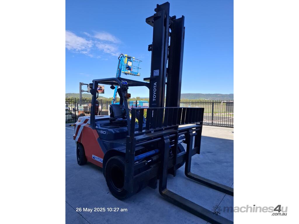 Toyota 8FD50N, 5 Tonne diesel with a 2-stage container mast with lifting capacity of 4.5m. Fitted with side shift and fork positioners. Extra wide carriage and long tynes/forks suitable to lift and move containers