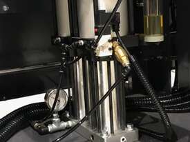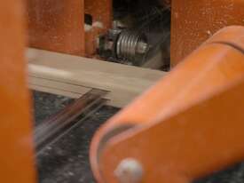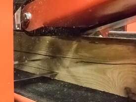 Control panel setworks with digital blade position controls ensure accurate height positioning of the saw wheels when setting cut thickness. Each blade has its own setworks panel and is controlled and run independently using the digital controls or manual up/down buttons. Once the blades are adjusted for the cut, the blade is engaged and material is fed through the machine. Cants and boards up to 16” wide and 12” high are placed onto the rugged, electric driven conveyor belt with a variable feed adjustment from 0 – 90 feet (0 - 27 meters) per minute for optimal processing of various sized and type of material. Pneumatic hold down rollers and an idle top roller keep material secure as it moves through the machine. Material is continually fed through the machine until processing is complete. Blade tension is automatic and controlled by an air-over-oil hydraulic system in order to maintain proper tensioning for longer blade life.