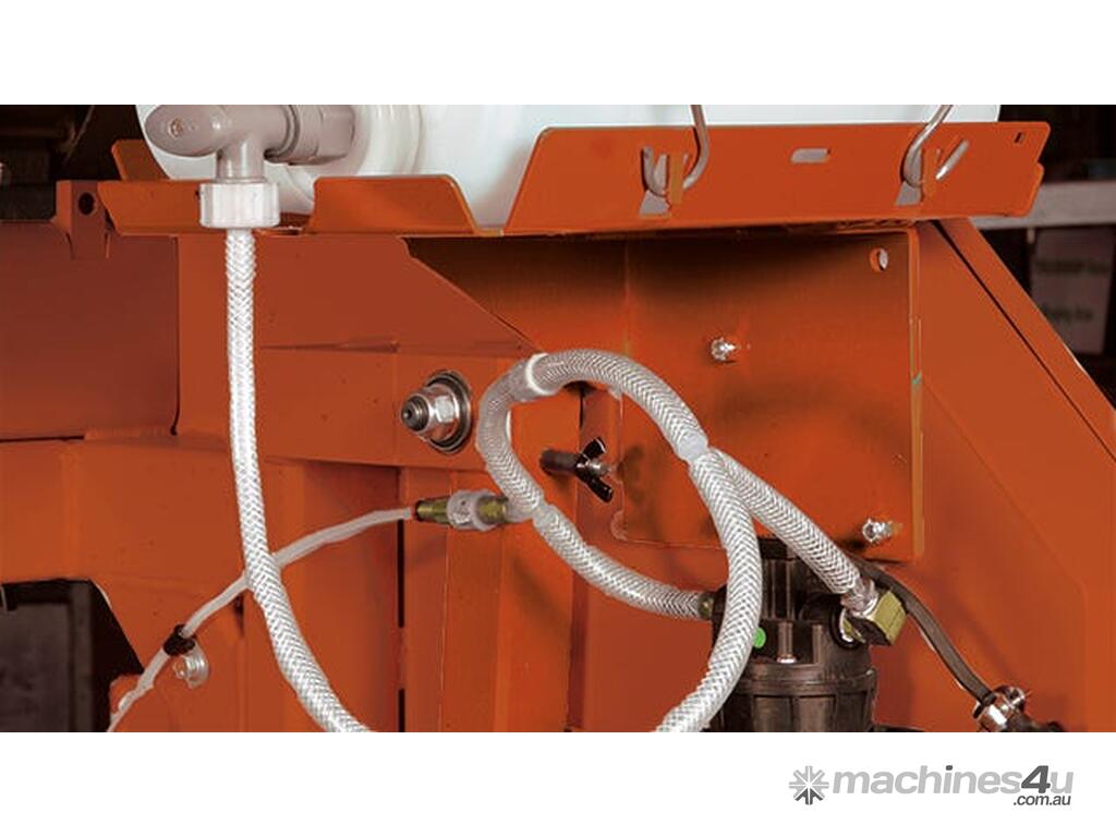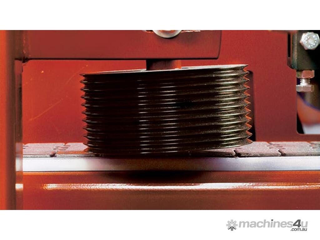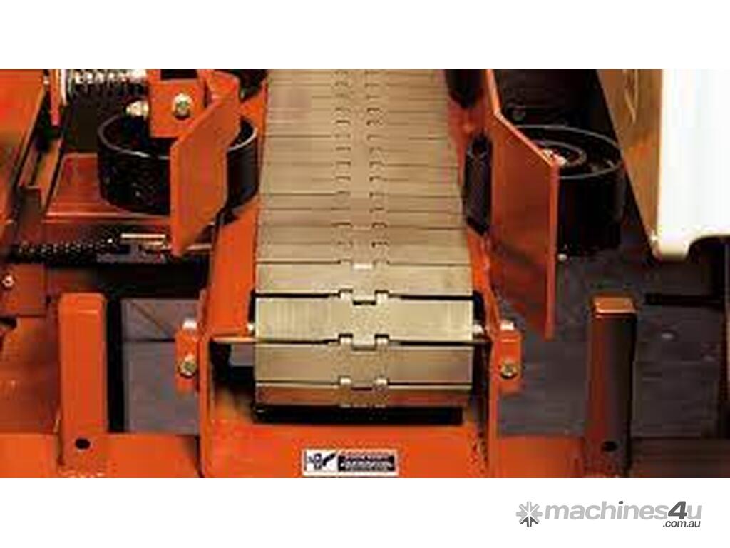 The steel track and heavy duty construction makes for a machine that will need minimal maintenance. Angled side rollers pull material tight against the belt and the sawing head can tilt to produce angled material.