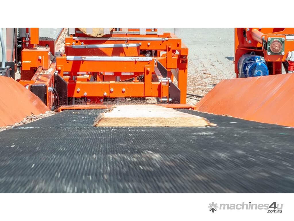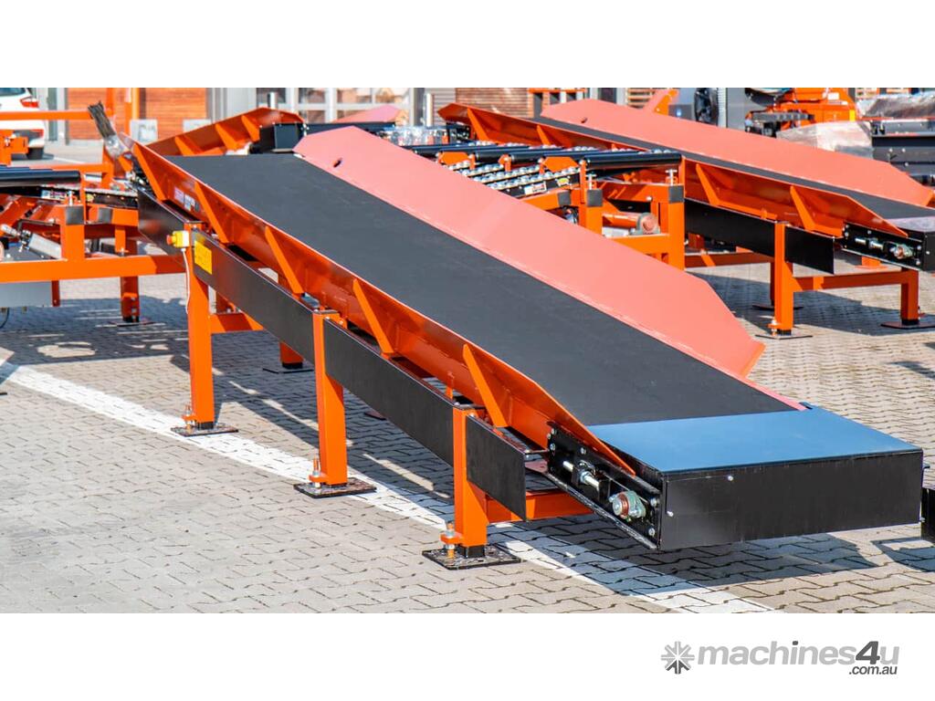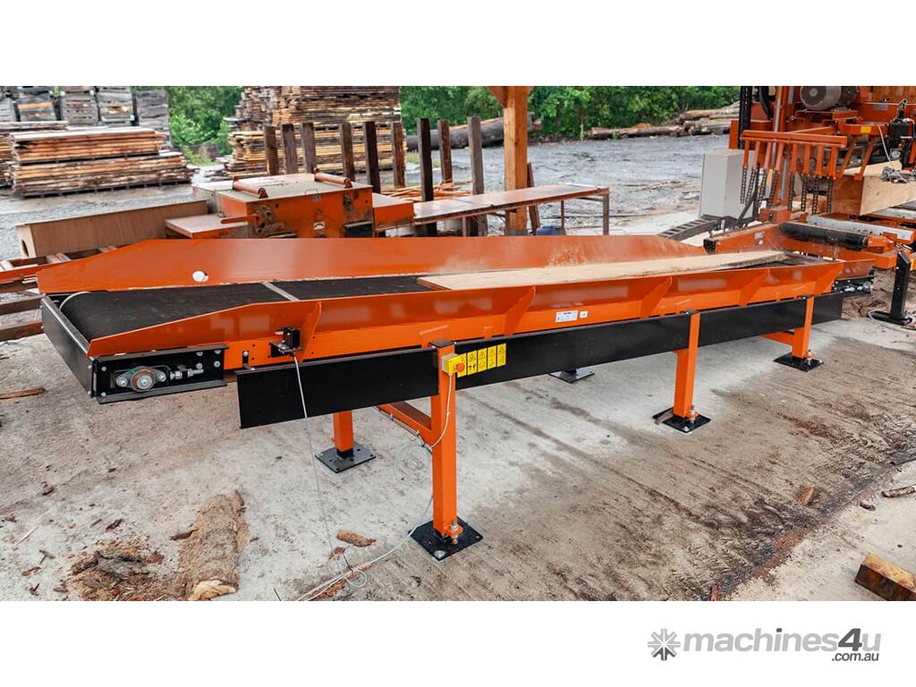 The conveyor is designed to mate with Wood-Mizer headrigs in dimension. As the cut piece is pushed off the mill, the conveyor receives it and transfers it away at a slight incline. By elevating the board, it can then move onto a Transfer Deck, or a Three-Way Conveyor for further handling.