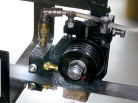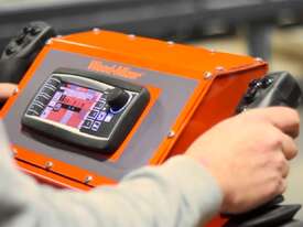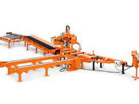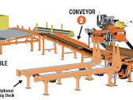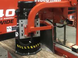 Loaded and turned hydraulically with loading arms and a heavy-duty bi-directional chain log turner, logs are secured onto the bed by four side supports (two hydraulically controlled vertical supports) and a heavy-duty hydraulic log clamp. Two hydraulic roller toeboards assist with precise leveling of the log on the bed for tapered logs. The operator can be set up at either end of the sawmill with the pedestal remote control station. Two joysticks control all head and bed functions of the sawmill including side supports, log clamp, log turner, toeboards, blade guide arm, and debarker. The joysticks can also control additional accessories such as log decks and incline conveyors. Similar to Accuset2 setworks, the control panel calculates board thickness to quickly and accurately position the sawing head automatically for the next cut while maximizing the yield per log. Once the blade is engaged with an auto clutch, the saw head advances through the log with the power feed control that includes variable speed for optimal sawing control. LubeMizer blade lubrication features an adjustable electronic flow controller and pump that applies a special lubricating solution to both sides of the blade in order to melt away sap that can slow down the blade while sawing. Deluxe board return fingers and a 0.9m x 1.5m outfeed table assists with offbearing boards. A debarker helps extend blade life between sharpenings by clearing a 6.35 mm wide path in front of the sawmill blade’s cut entry. The adjustable blade guide arm keeps the blade well supported while cutting various sized material. Blade tension is easily adjusted, and keeps the blade at the proper tension for cutting.