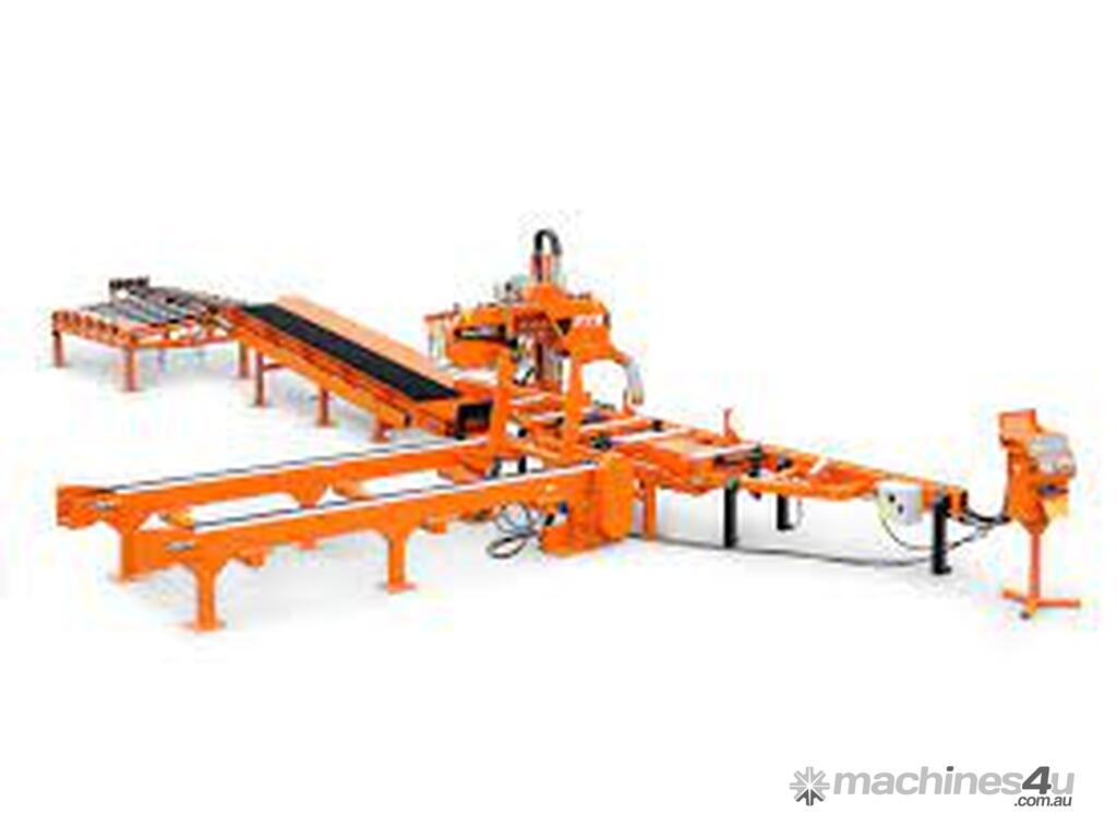 Fully-loaded super hydraulic portable sawmill featuring deluxe engine-powered hydraulic log handing and saw head controls, pedestal control station with joysticks, dragback fingers with outfeed table, debarker, and more!