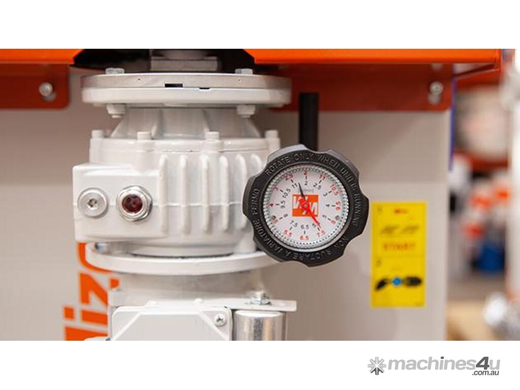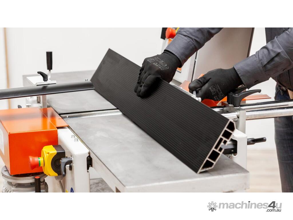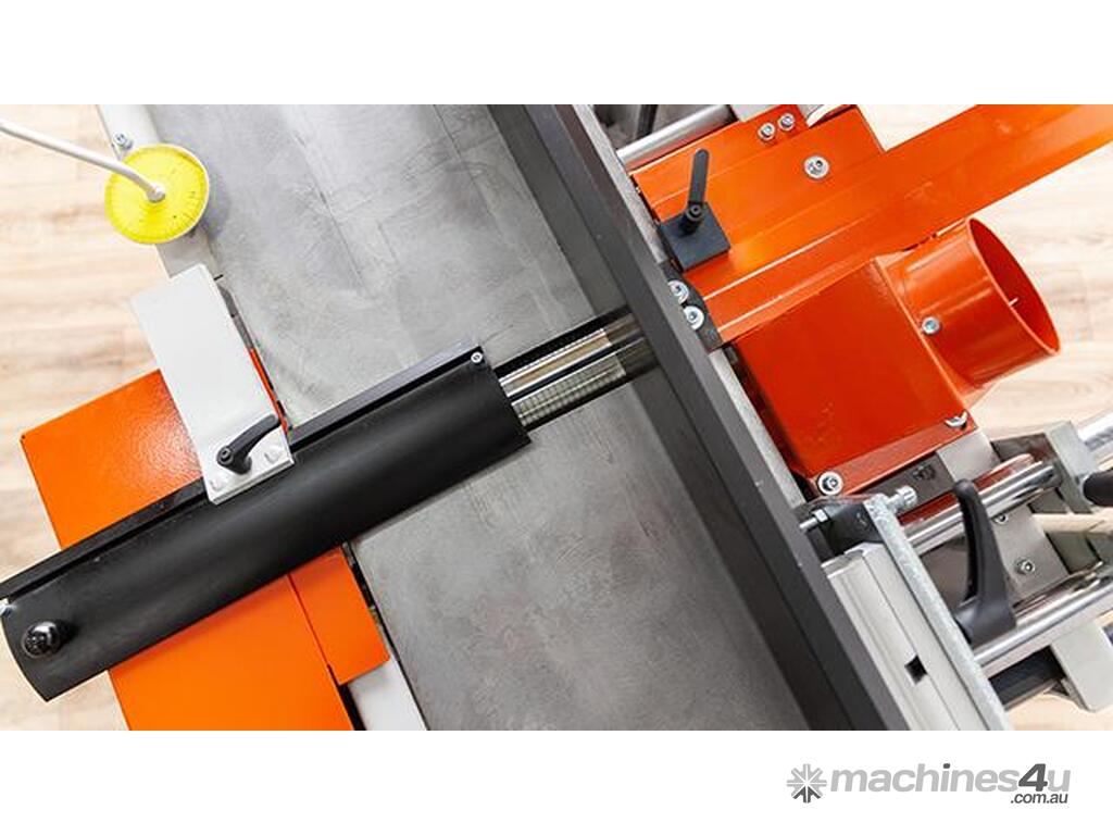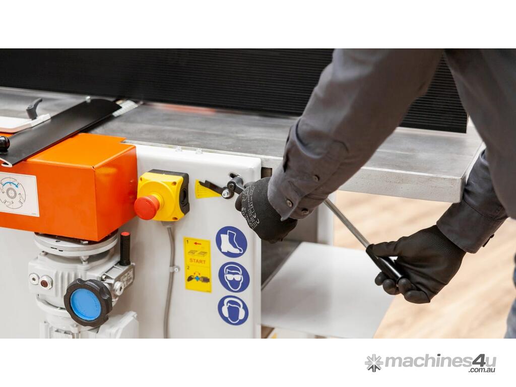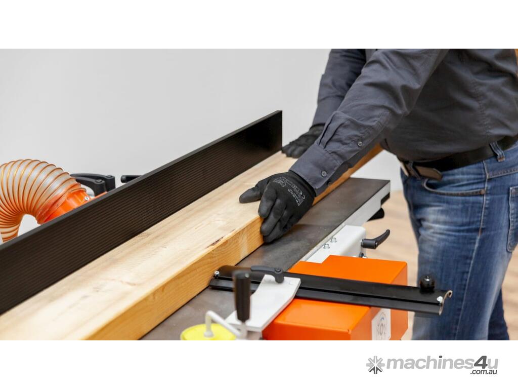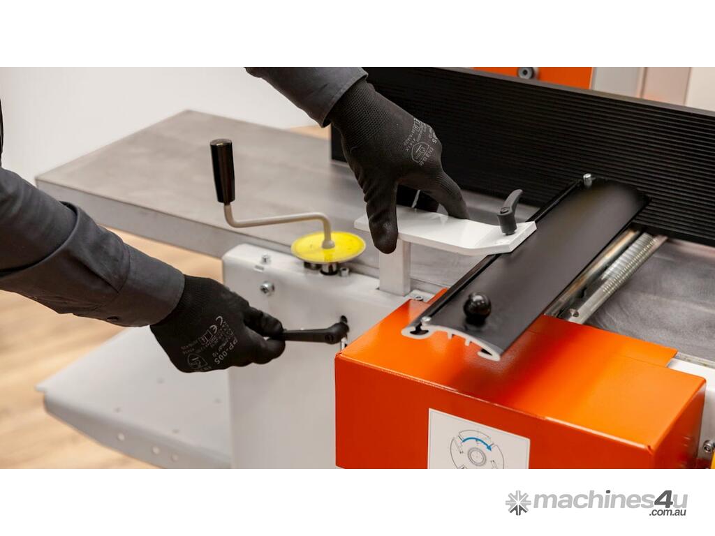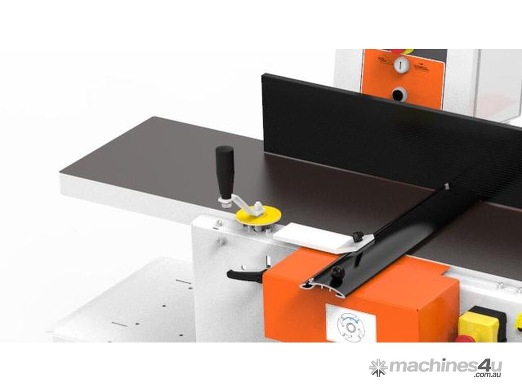 A safety guard keeps your hands safe during jointing (planing). The board fence tilts up to 45 degrees for jointing angled boards. The top and bottom tables can be adjusted as needed, and the infeed and outfeed tables always remain parallel to each other. The outfeed table can be fine-adjusted. Two power rollers pull your board under the cutter. The power feed has an industrial gearbox.