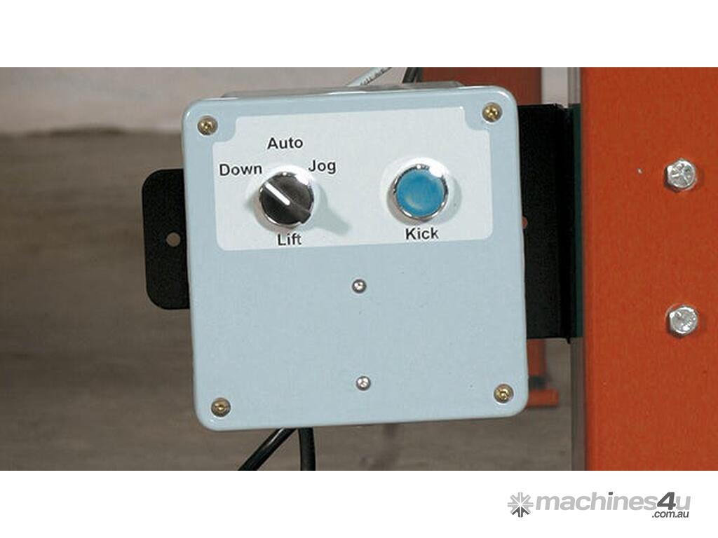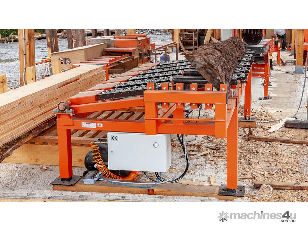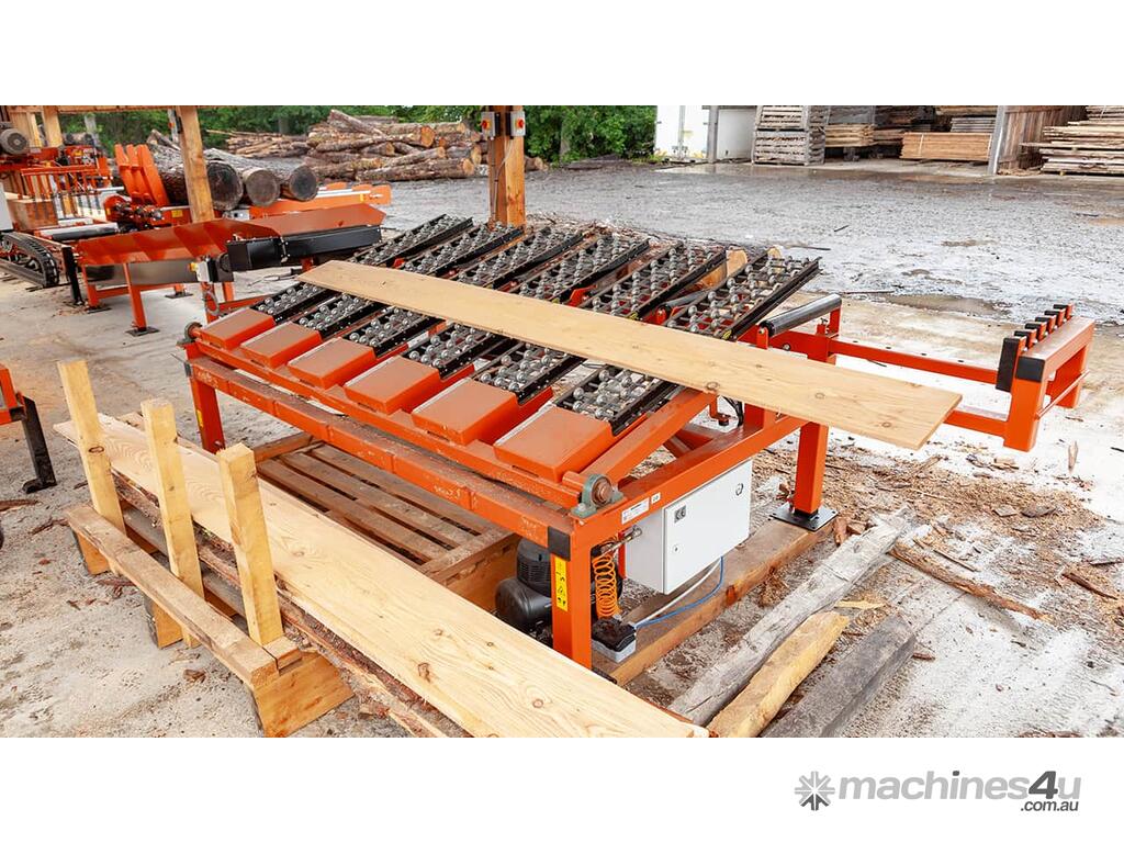 Pneumatic kickers can push slabs, cants or boards off the side of the roller deck for further handling.