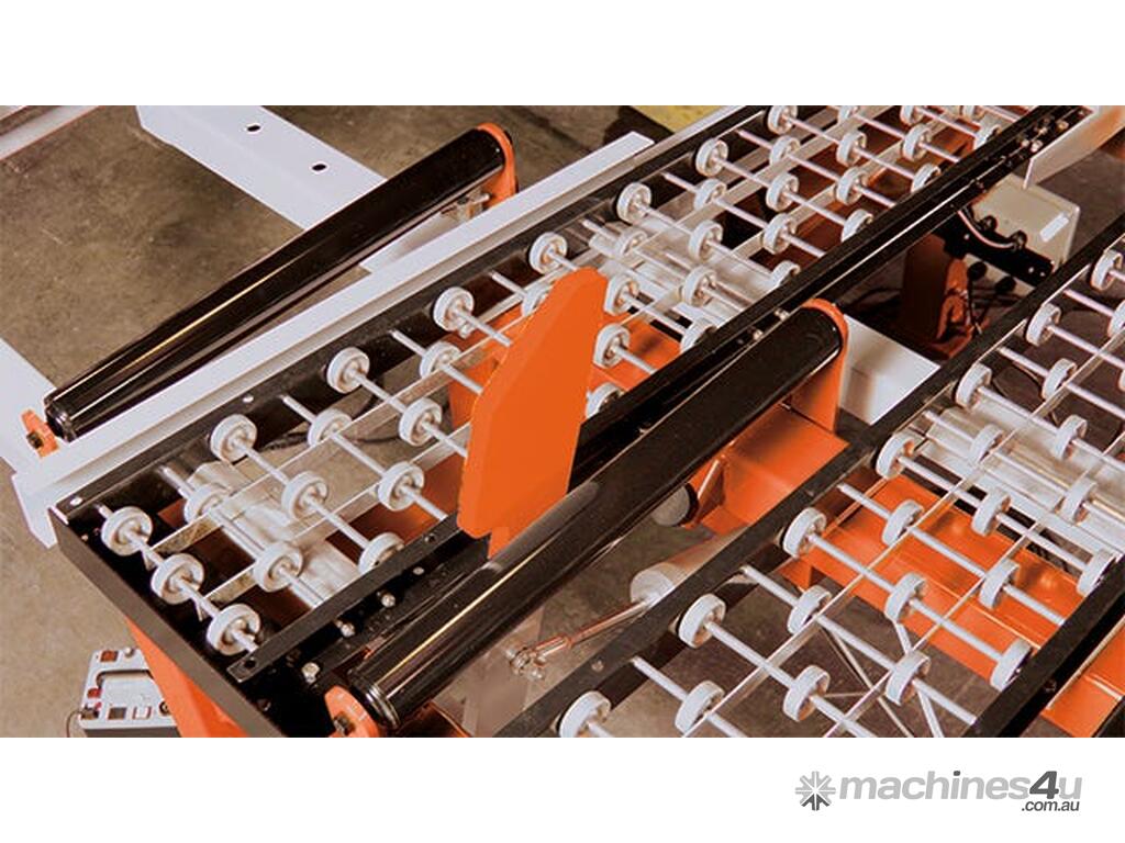 This unique piece is a brilliantly simple way to transfer material quickly and efficiently. After the material moves onto the rollers from the Incline Conveyor, a sensor activates an air bag which is connected to a set of inclined cross transfer rollers. The cut piece then rolls down the incline to a stop location, or onto another conveyor. Alternatively, the sawyer or other operator can activate pneumatic kickers to push the piece off the opposite side. There are no chains, gears, or motors, which makes operation simple with little maintenance. The Transfer Table can be set up for either right or left hand operation.
