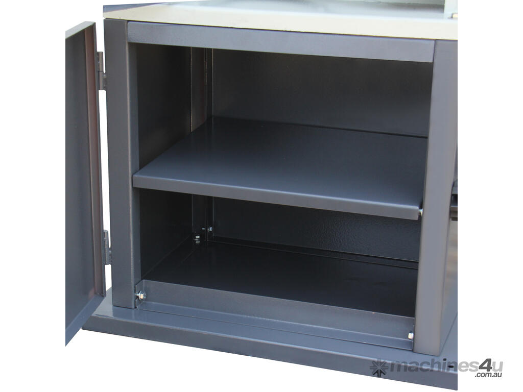 Storage and Portability Vertical Saw. Built-in metal cabinet base keeps accessories organized, ideal for space-conscious Australian sheds.