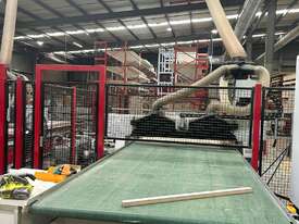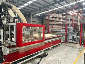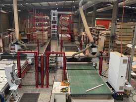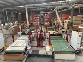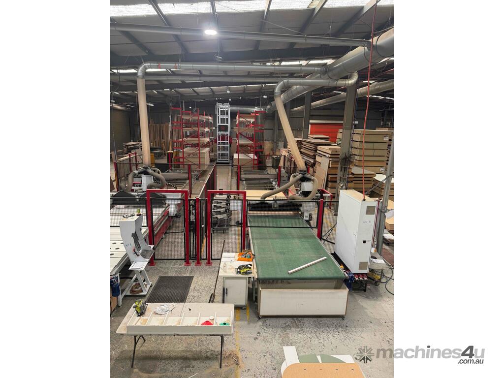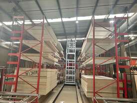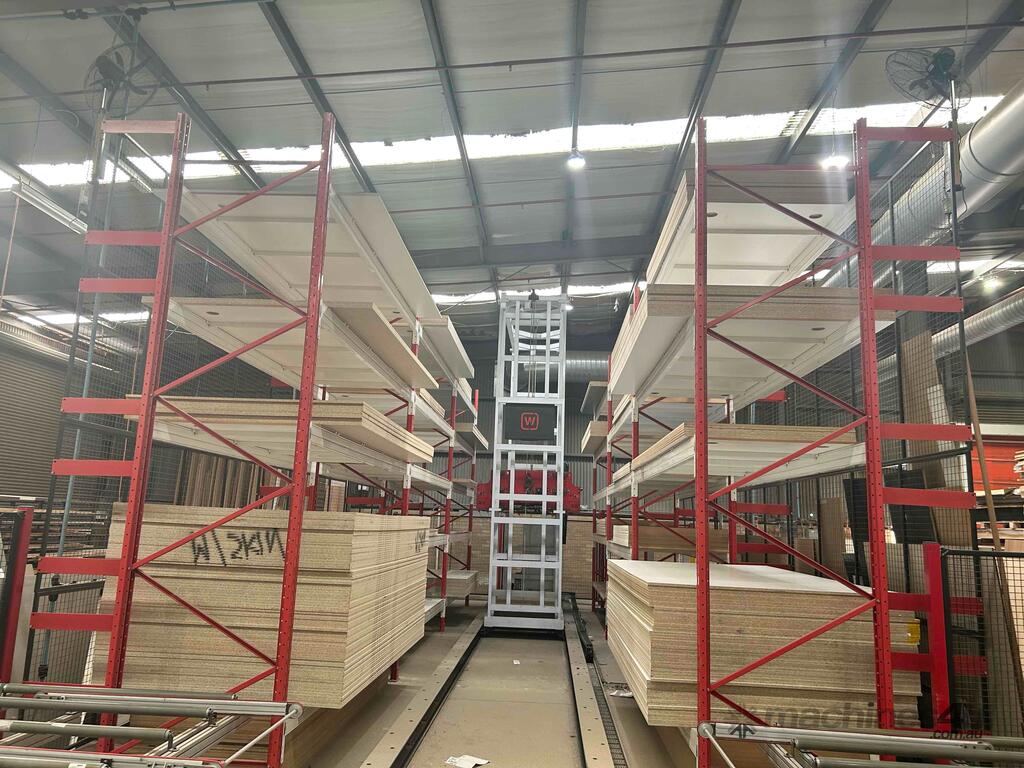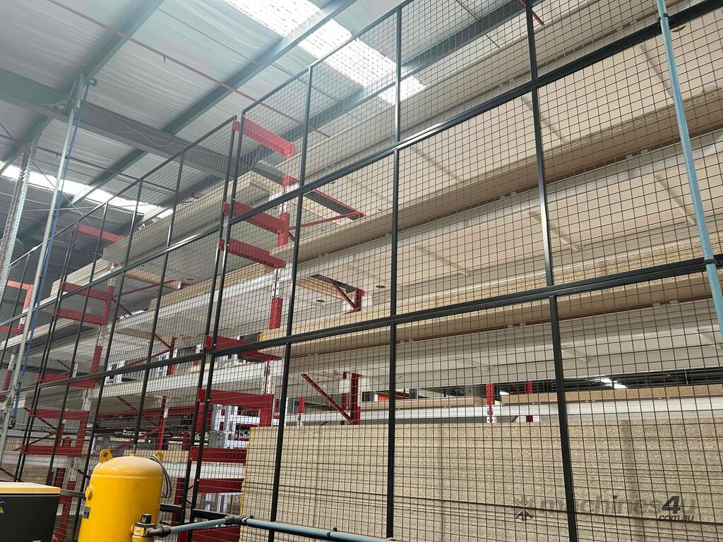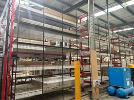 System is dismantled and ready for relocation. Lots of board storage 25M long 10M high Racking system capable of feeding 2 x CNC machines ( Modifications will be required depending on CNC machines) The CNC calls the sheets from the Cube, reducing CNC downtime, board handling & the need to make ranibow packs.
