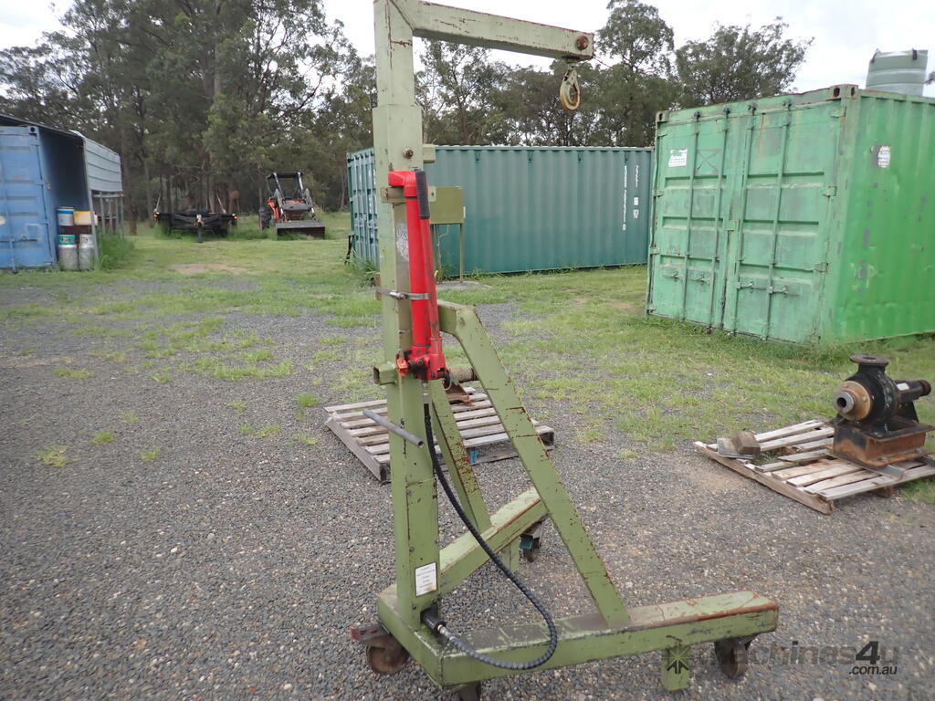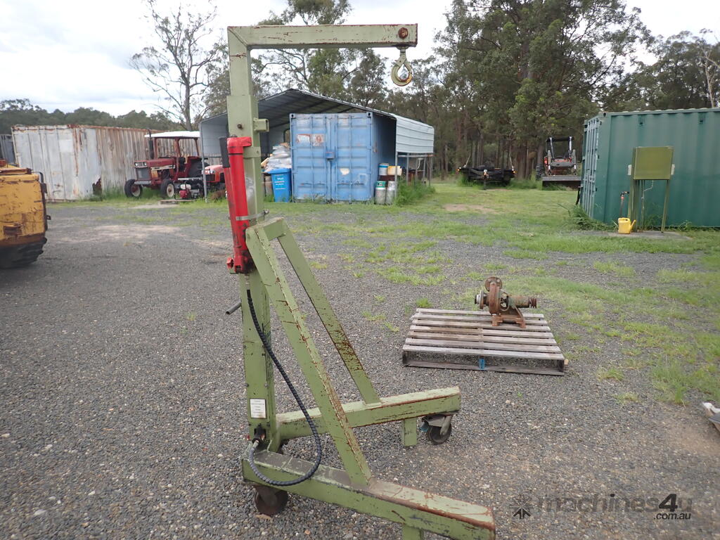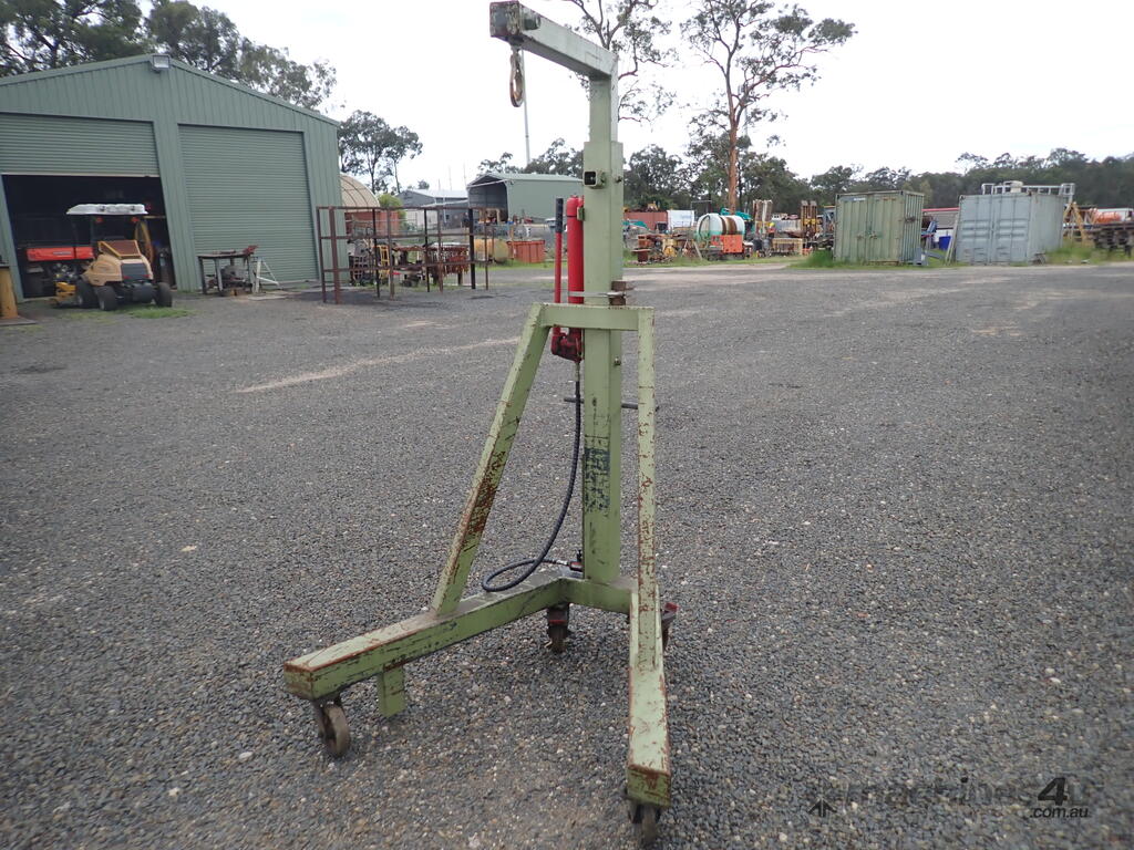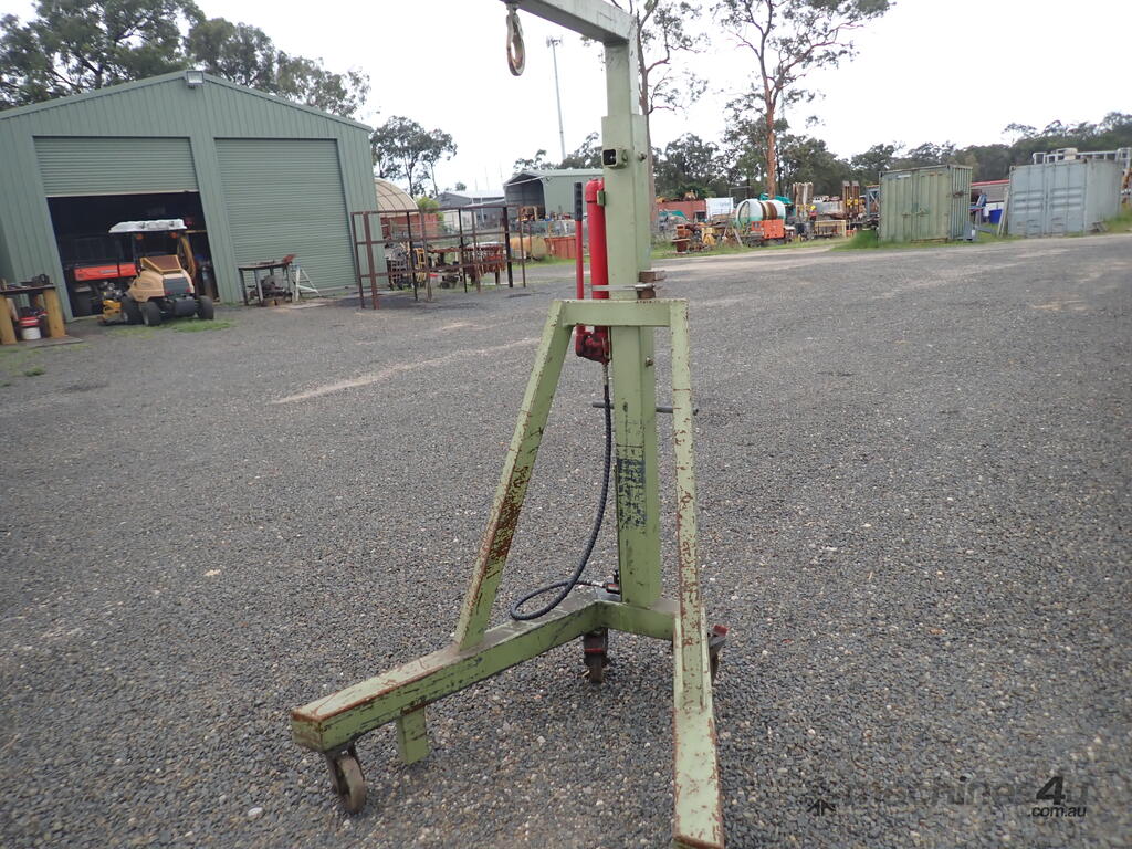 Workshop/engine crane, 1 ton capacity, custom made, has Enerpac ram with about 300mm stroke , manual hydraulic pump, vertical lift, swivel hook, mounted on 4 castor wheels, good solid unit, suit small engineering or mechanical workshop or home workshop/shed, previously used in a machine shop for for lifting into & out of lathes, good condition.