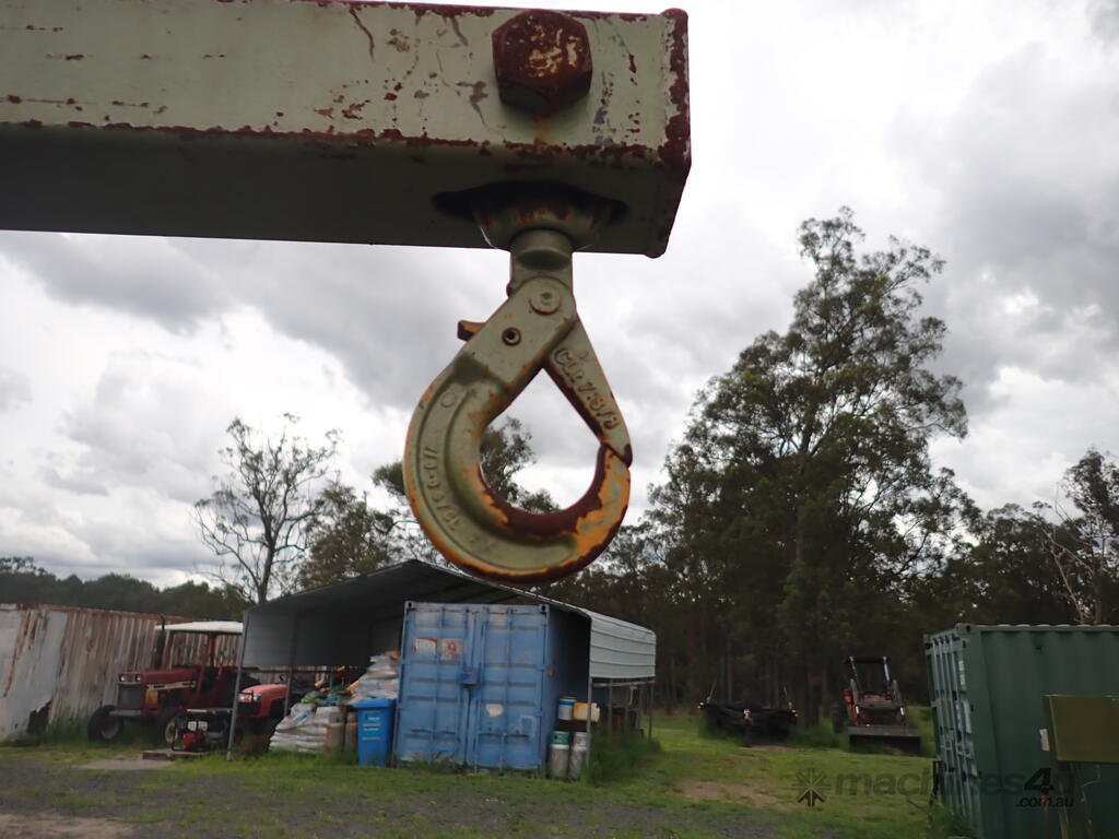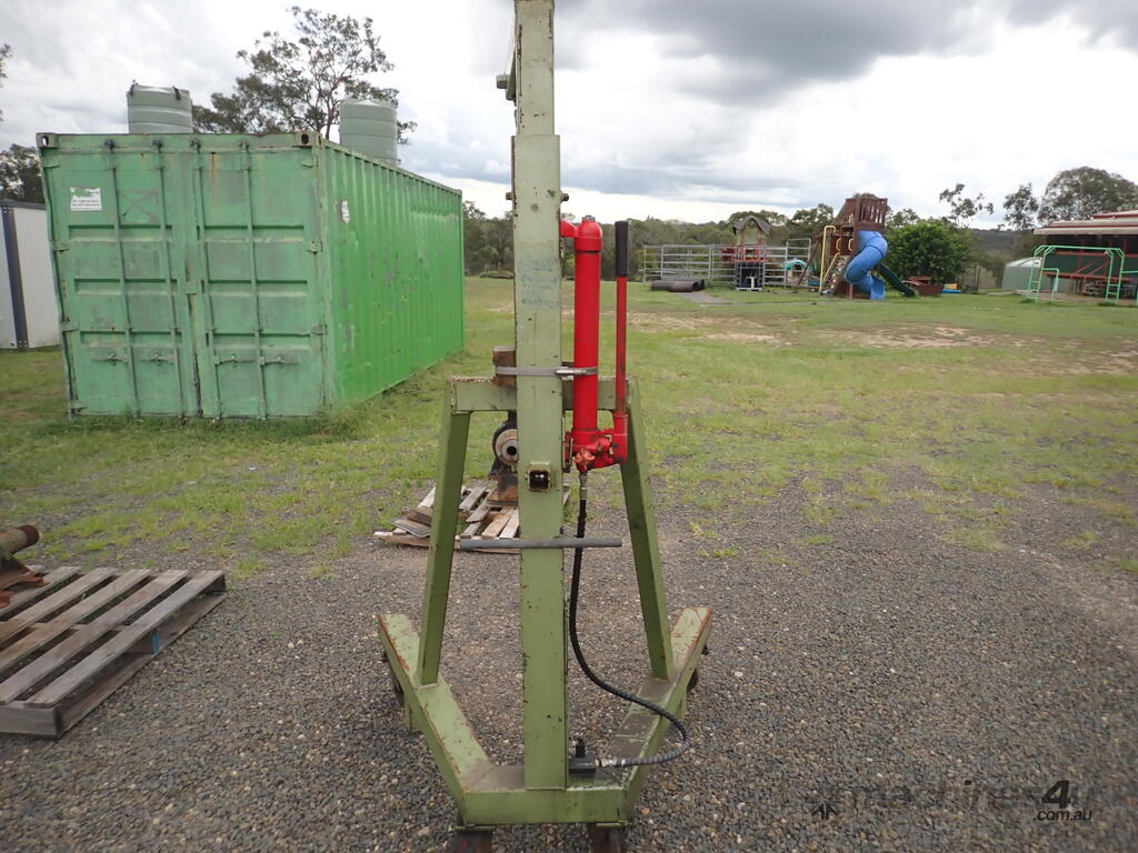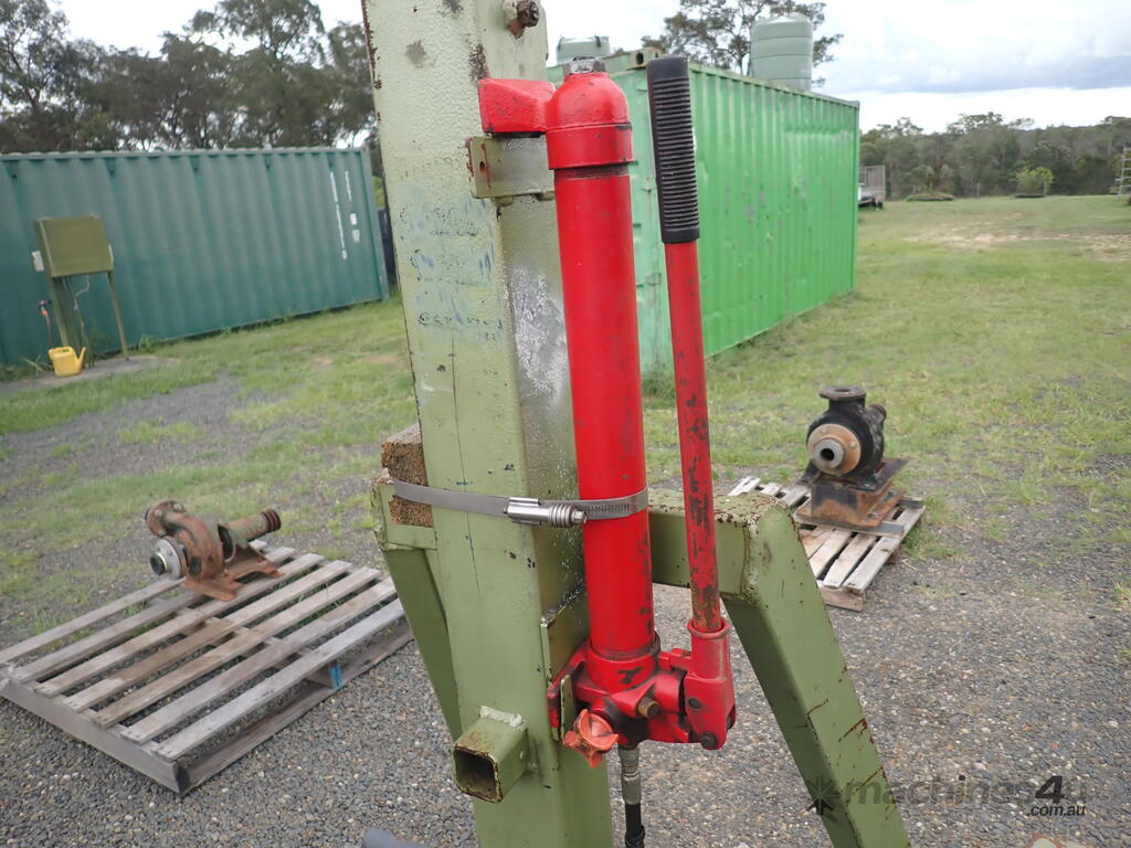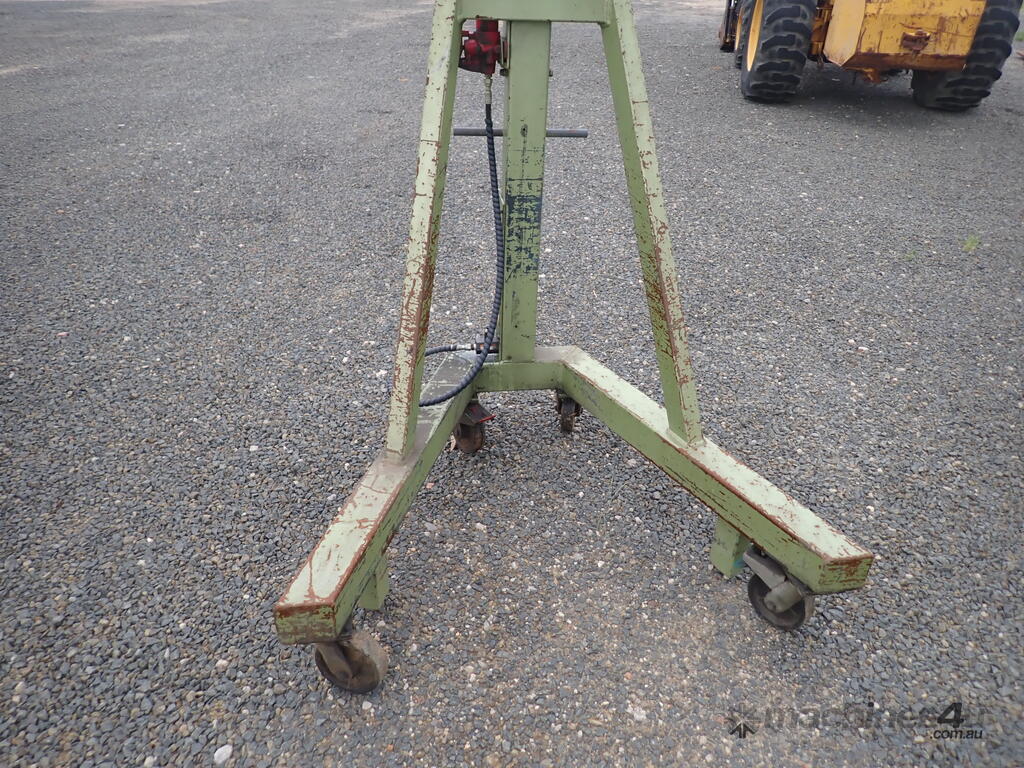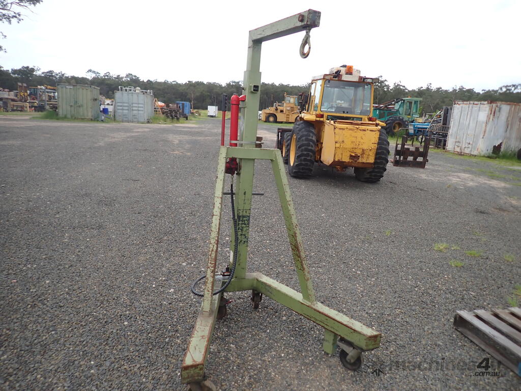 Workshop/engine crane, 1 ton capacity, custom made, has Enerpac ram with about 300mm stroke , manual hydraulic pump, vertical lift, swivel hook, mounted on 4 castor wheels, good solid unit, suit small engineering or mechanical workshop or home workshop/shed, previously used in a machine shop for for lifting into & out of lathes, good condition.