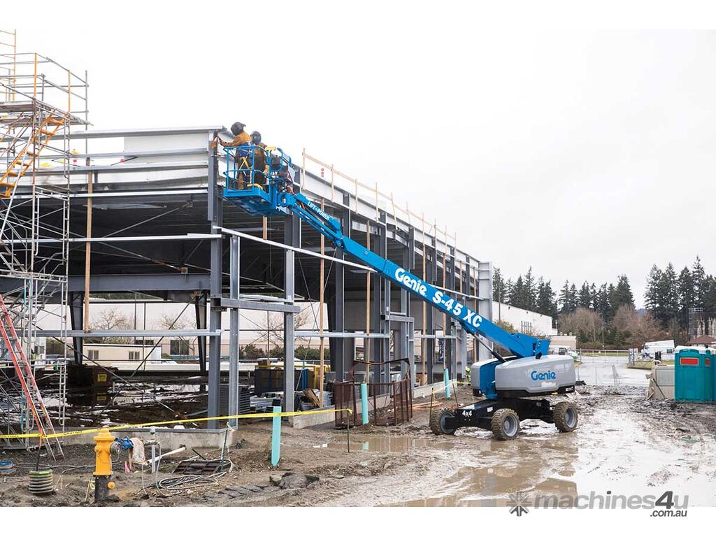 The Genie® S-45 XC™ telescopic boom is engineered to work in more applications that require higher capacities. With industry-leading dual lift capacity — 300 kg (660 lb) / 454 kg (1,000 lb) — a smooth operating envelope, this new XC boom lift is a perfect fit for your customers’ heavy lifting in construction, bridge inspections and maintenance, stadium and sports arena, gas and oil refineries, industrial, telecommunications and utility applications.