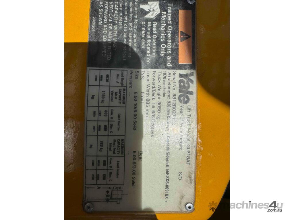 Yale forklift 1.8 lpg with sideshift,clearview mast and solid tyres.Has only ever had 1 owner from new.This unit is immaculate and mechanically A1.Very compact and zippy forklift can be viewed by appointment only in Pakenham Vic.