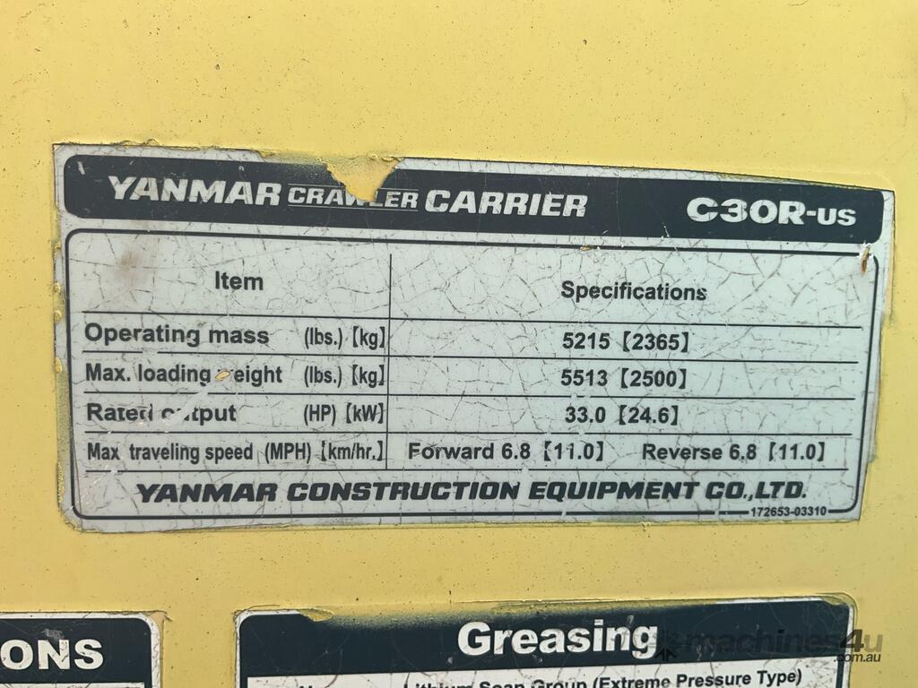 No C/P,Yanmar,C30R-US,Dumper (Rubber Tracked),Engine #: 18227,3 Cyl,Diesel,Odometer not visible,1242 (Hrs. Showing on Hour meter),Colour: Yellow,Unregistered,Serial No: 00509C,ROPS No: AC60255,FOPS No: AC60255,Sold with No Plates,Key No: 563E