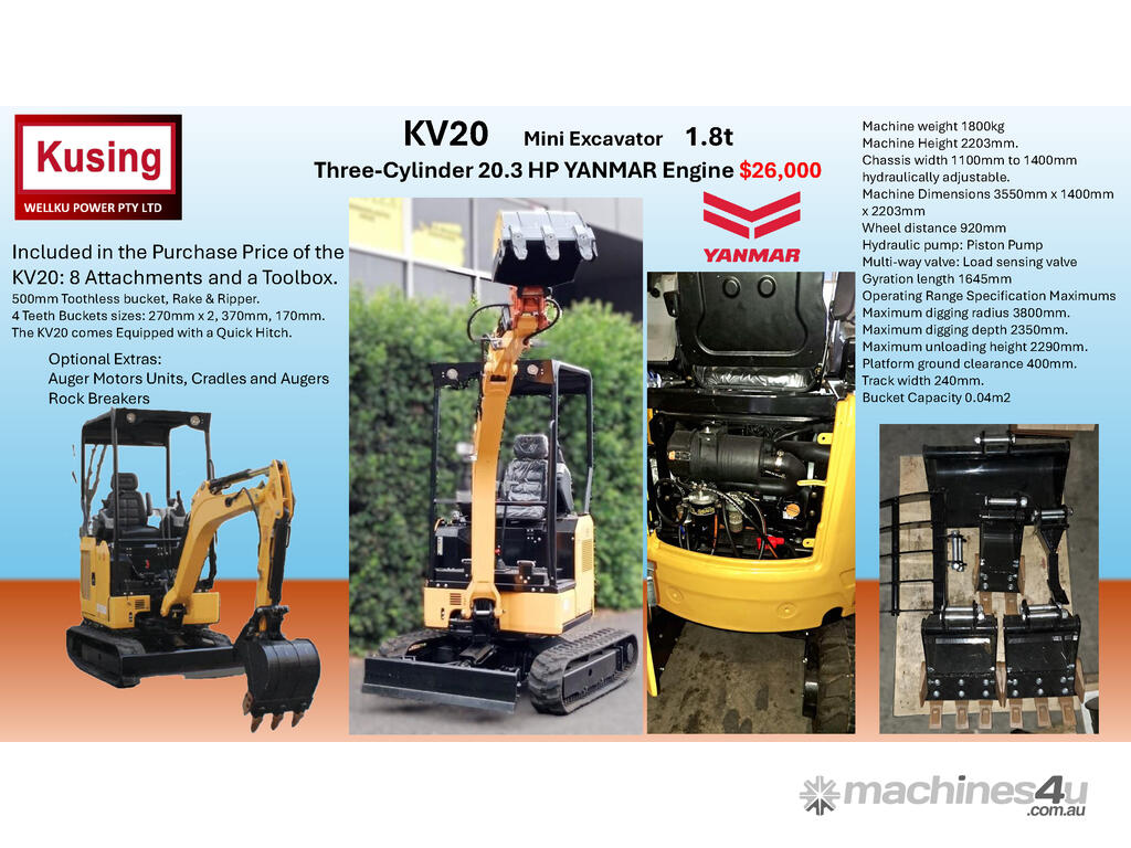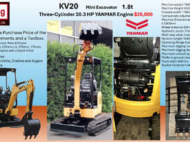 Whether you need to dig, grade, or dump the KV20 Mini Excavator YANMAR Three-Cylinder 3TNV80F-SNSY skid steer excavator is a compact unit you can operate it where space is limited, with a large load capacity as our units come standard with a selection of 7 attachments included + Toolbox.