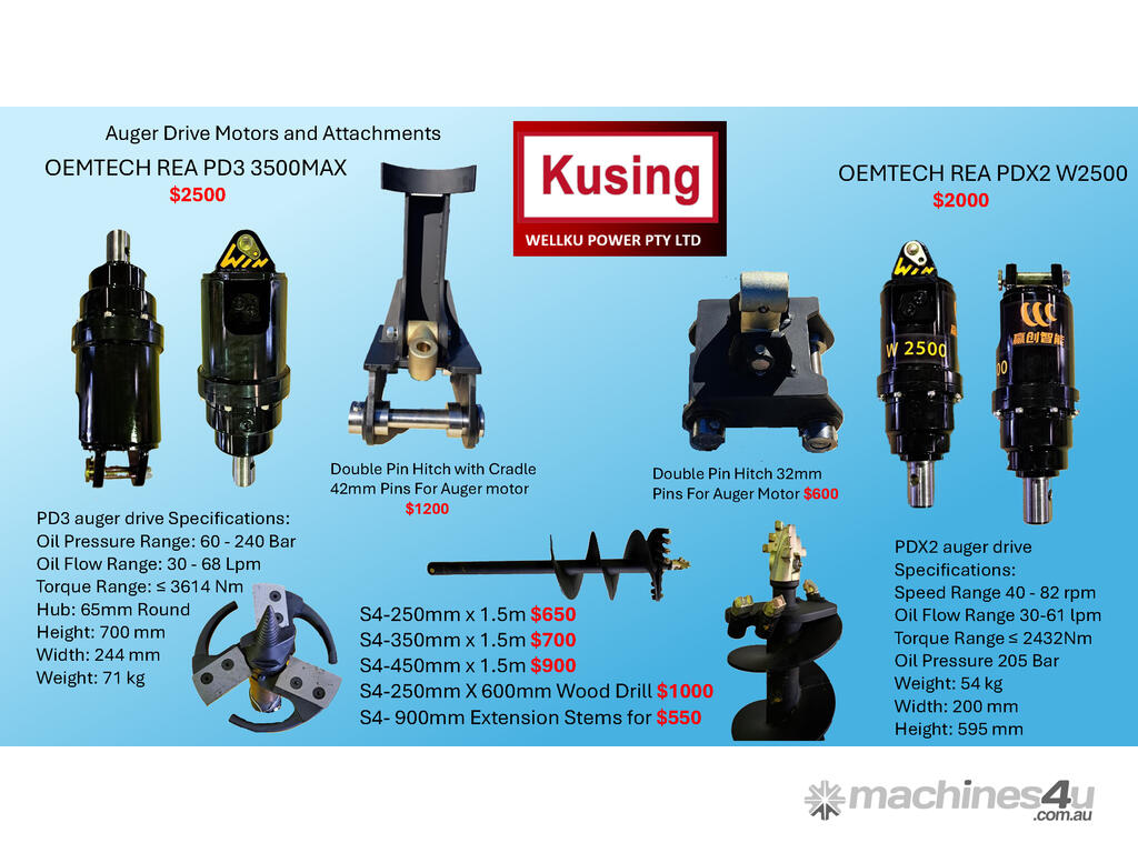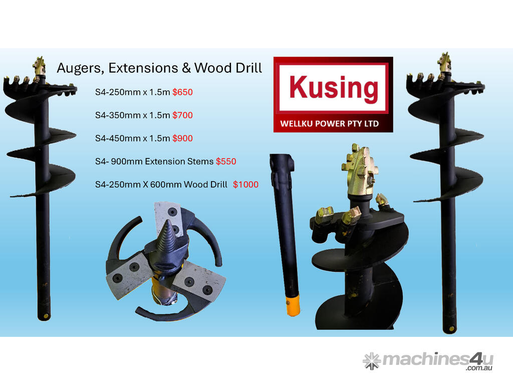 Auger drill bits S4-250mm x 1.5m, S4-350mm x 1.5m, S4-450mm x1.5m, S4-250mm X 600mm Wood Drill & S4- 900mm Extension