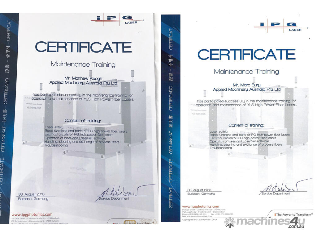 Our service manager, Matt Keogh, along with senior service engineer Mark Bury are both factory-trained by IPG (Germany) in the maintenance of IPG YLS series high power fiber lasers.