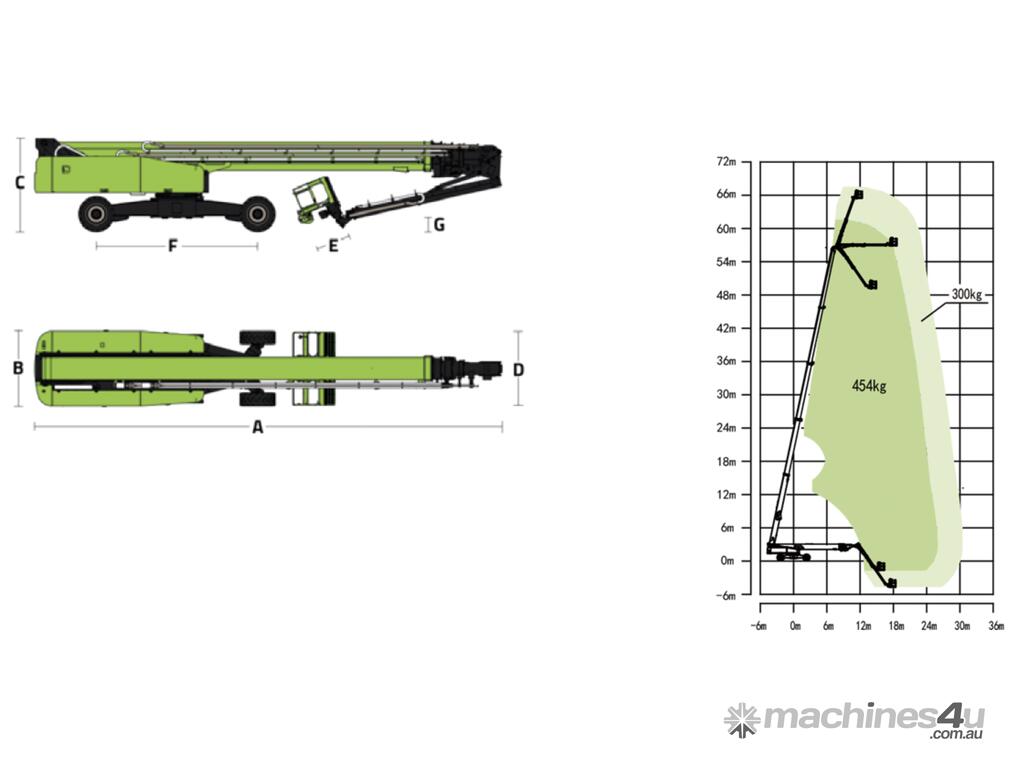 - Highest self-propelled telescopic boom lift with a Work height of 67.5m and a horizontal outreach of 31m (ZT68J Only)