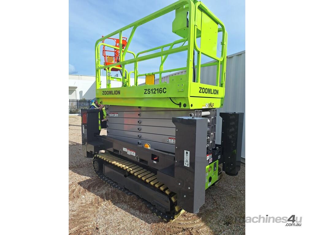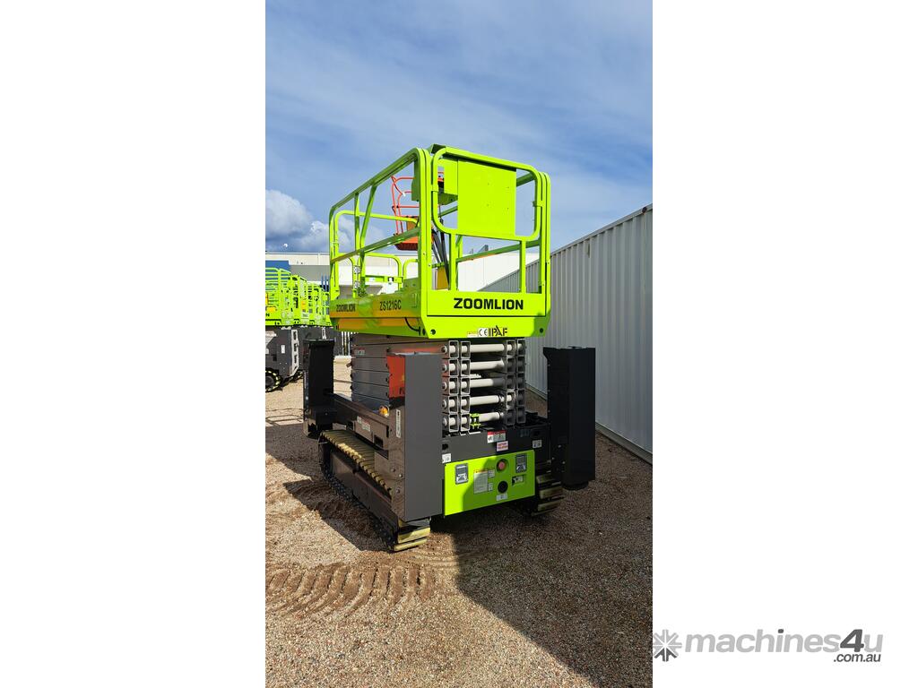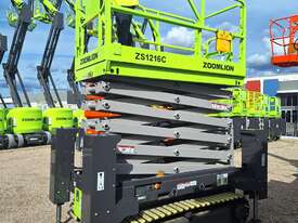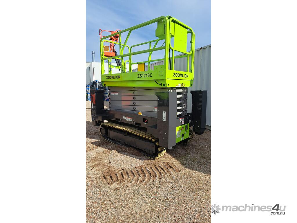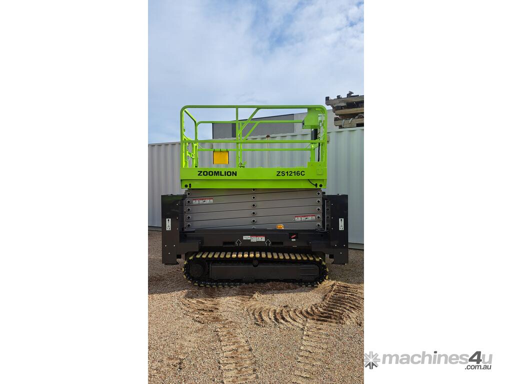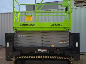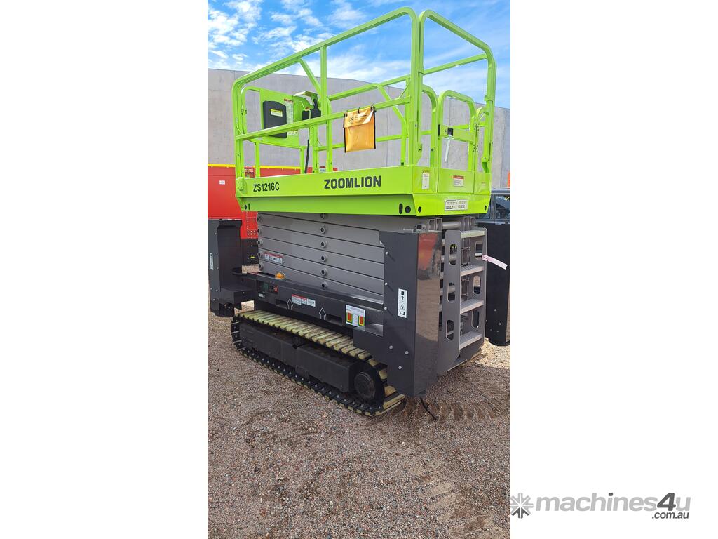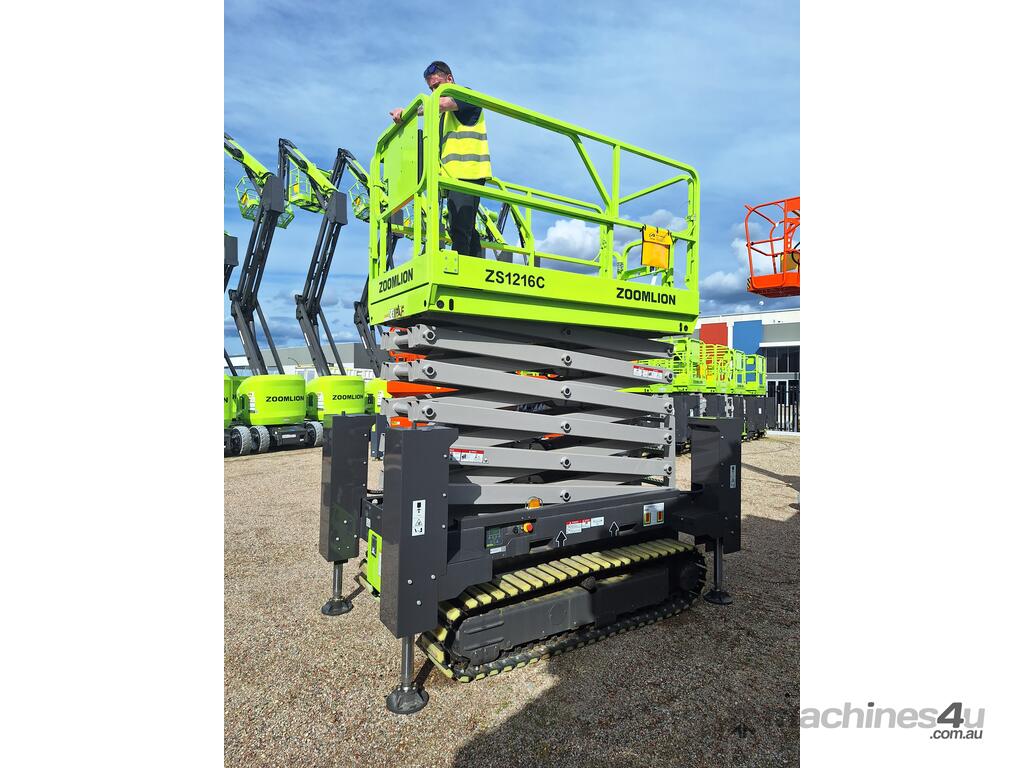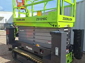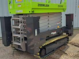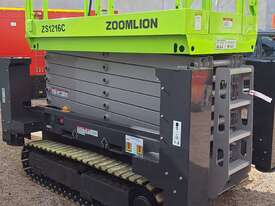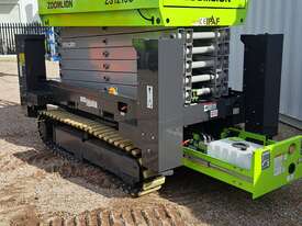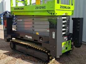 The ZS1216C is a 38ft electric tracked scissor lift designed for rough-terrain access where stability and traction are essential. It delivers a working height of 45ft 3in (13.8m), platform height of 38ft 9in (11.8m), and a 350kg lift capacity for safe elevated work. The 1.6m wide tracked undercarriage provides strong grip on uneven ground while maintaining low ground pressure for softer surfaces. Dual rear-wheel drive motors and proportional controls provide smooth performance during elevated and stowed travel.