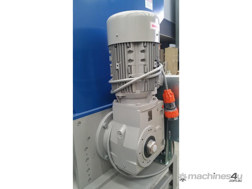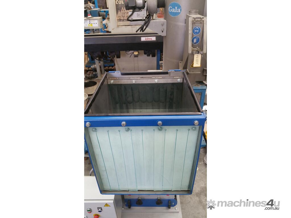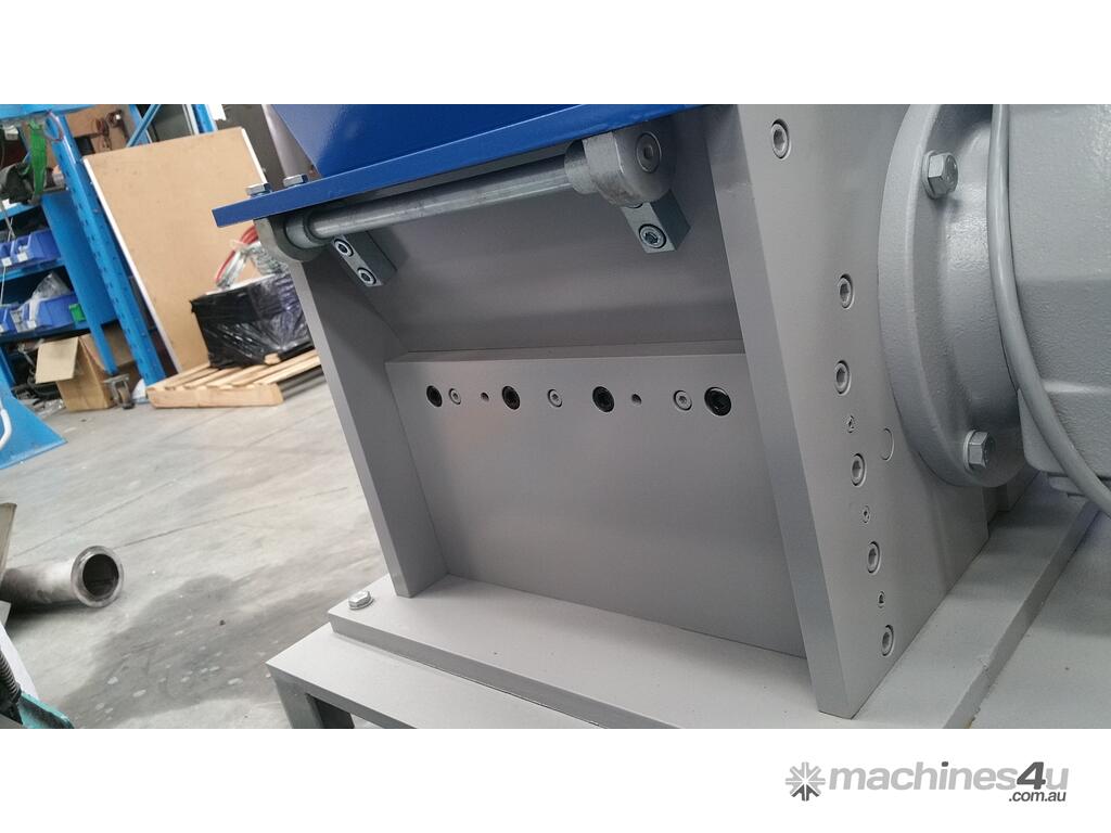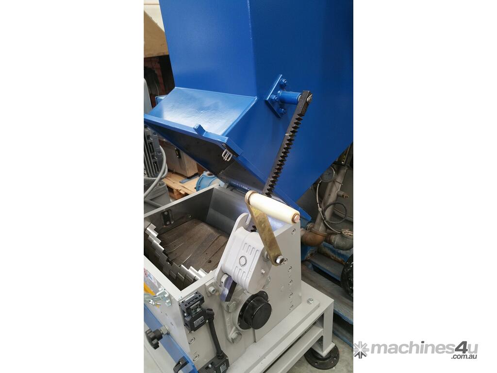 The V shaped arrangement of the staggered rotor blades holds pre-cut material in the center of the cutting chamber. This prevents material sticking to the side walls and considerably reduces wear on the grinding chamber walls when processing fibre and glass reinforcesd plastics. The staggered rotor blades means only one blade cuts at once thus increasing the cutting torque.
