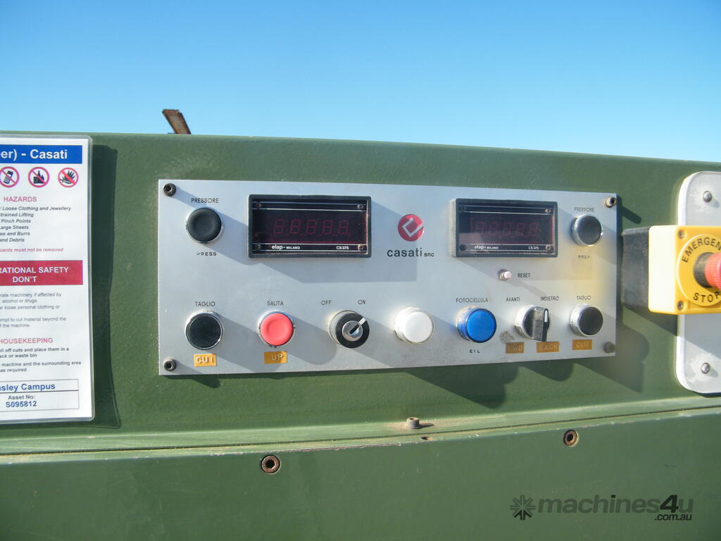 sliding knife guilotine suit wood panelling, veneers, paper, vinyls etc Caside 3 ph 2400mm cut electrical back gauge safety eyes as new machine