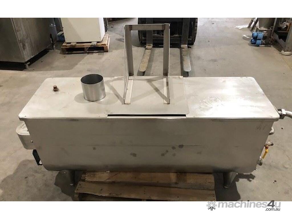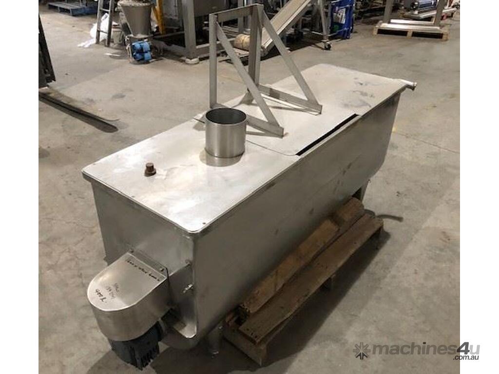 Stainless steel 400lt paddle mixer. 1.6mt long x 490mm wide x 600mm high. 2 inch outlet at one end. Hinged lid in centre. 0.37kw 139 rpm.